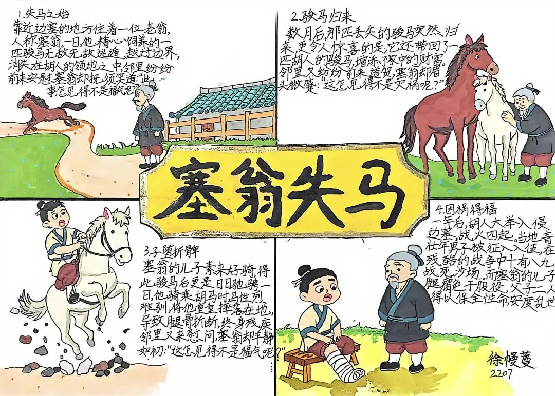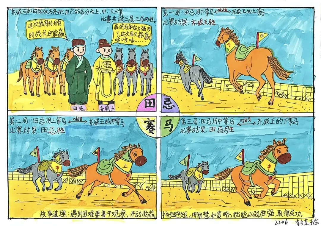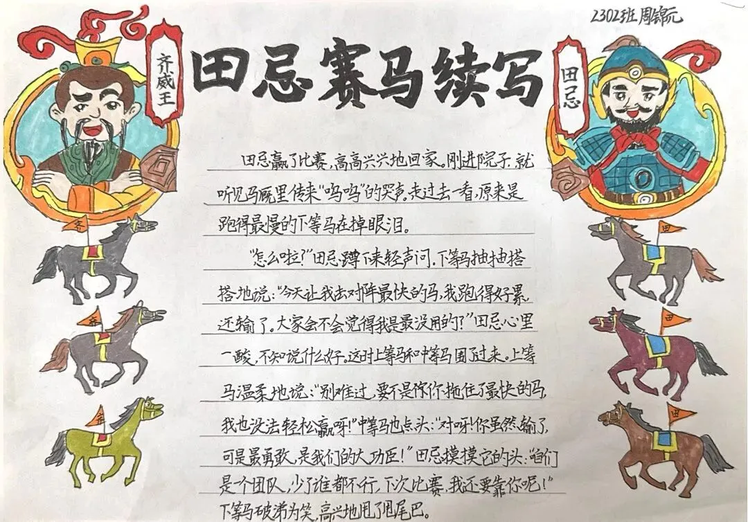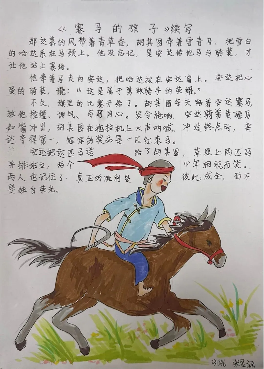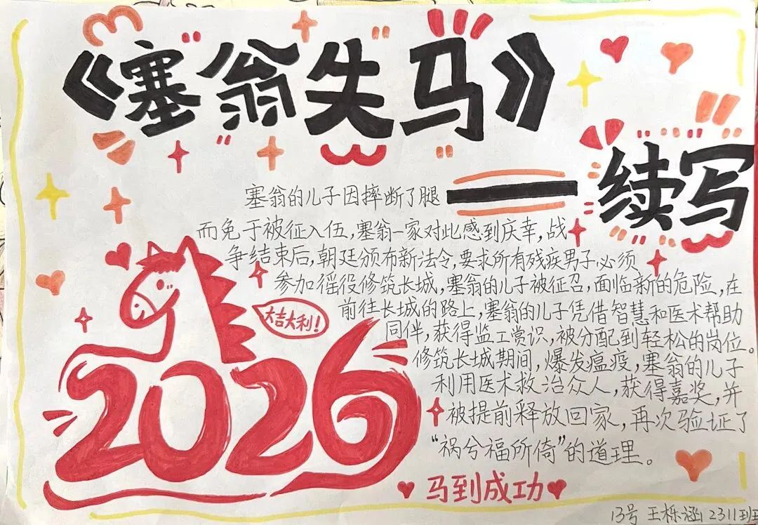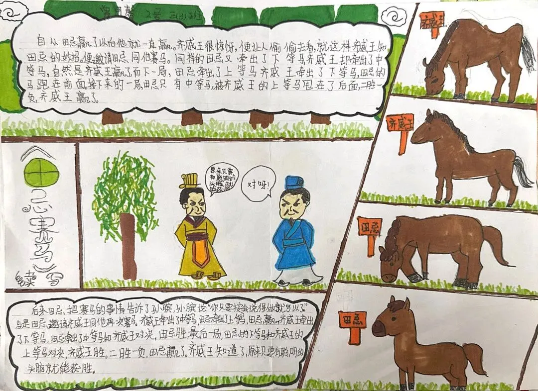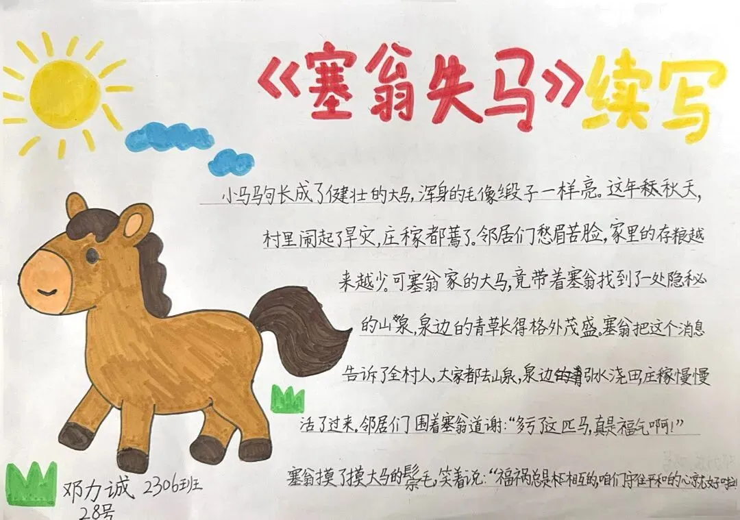 三年级的同学们在阅读《塞翁失马》《田忌赛马》等经典故事后,展开丰富想象,进行故事续写。他们以细腻的文字铺展情节,用独特的视角延展故事,在创作中体会思考的乐趣,感悟故事中蕴含的生活智慧。一篇篇作品文从字顺、想象丰富,展现了孩子们日益提升的表达能力与思辨意识。