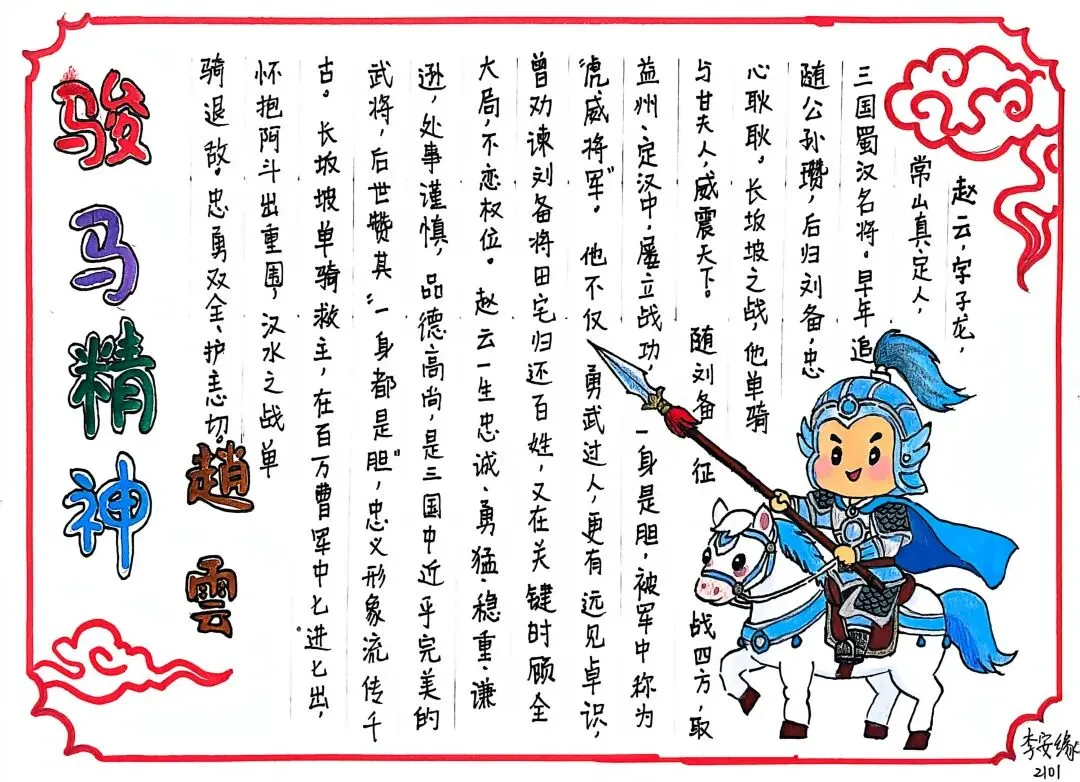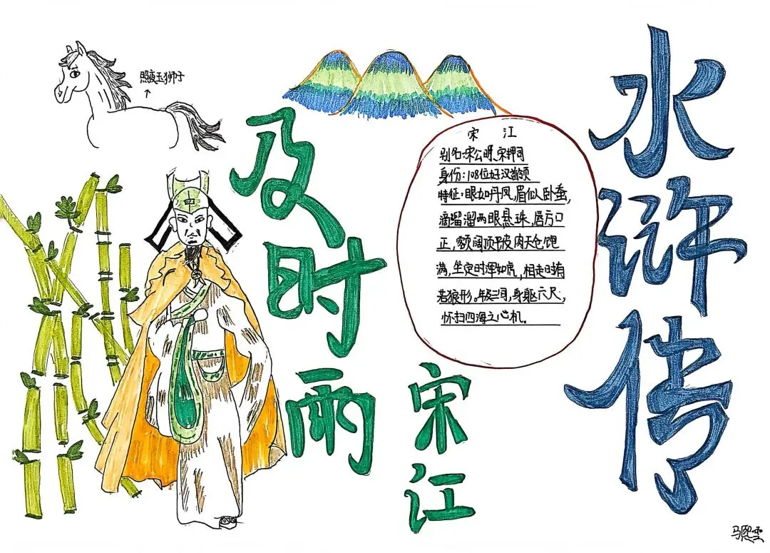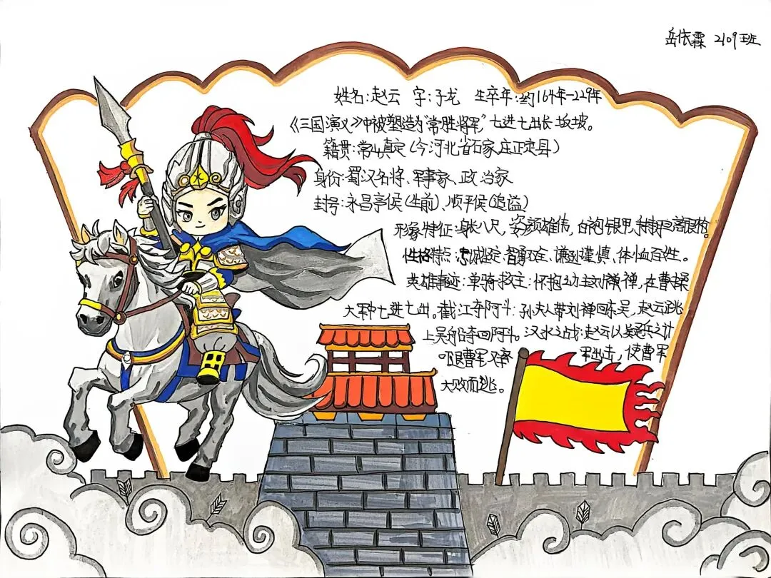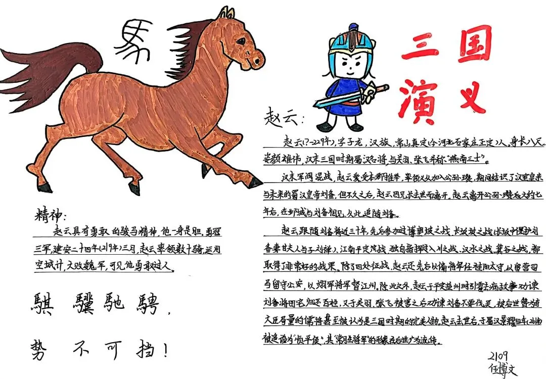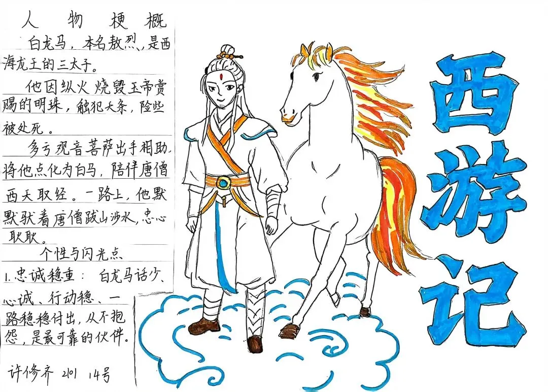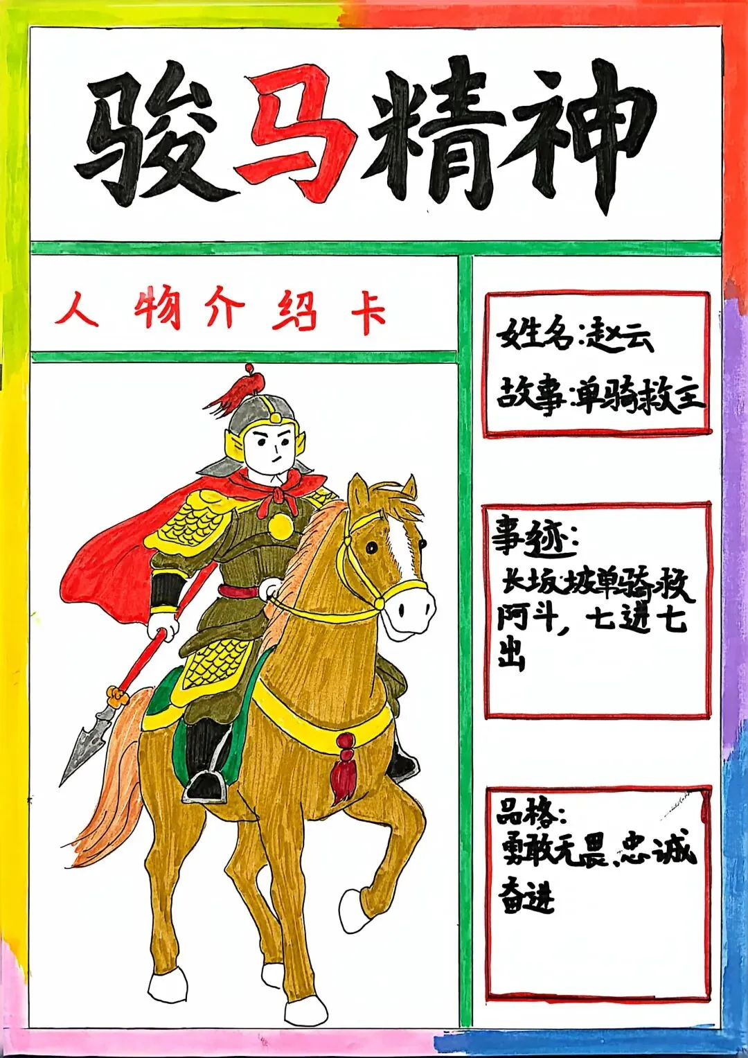 五年级的同学们走进《三国演义》《水浒传》《西游记》等经典名著,品读英雄人物,汲取精神力量。大家精心制作人物介绍卡,梳理人物事迹,感悟“骏马精神”的品格力量,在阅读与梳理中提升理解能力、概括能力与审美素养。一张张卡片结构清晰、内容充实,展现了高年级同学沉稳踏实、善思善学的良好风貌。