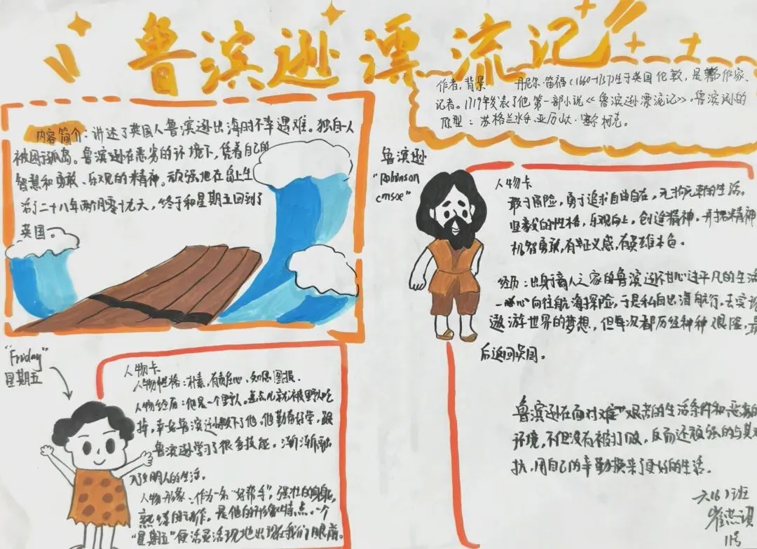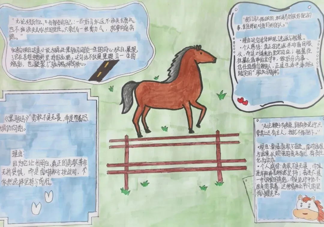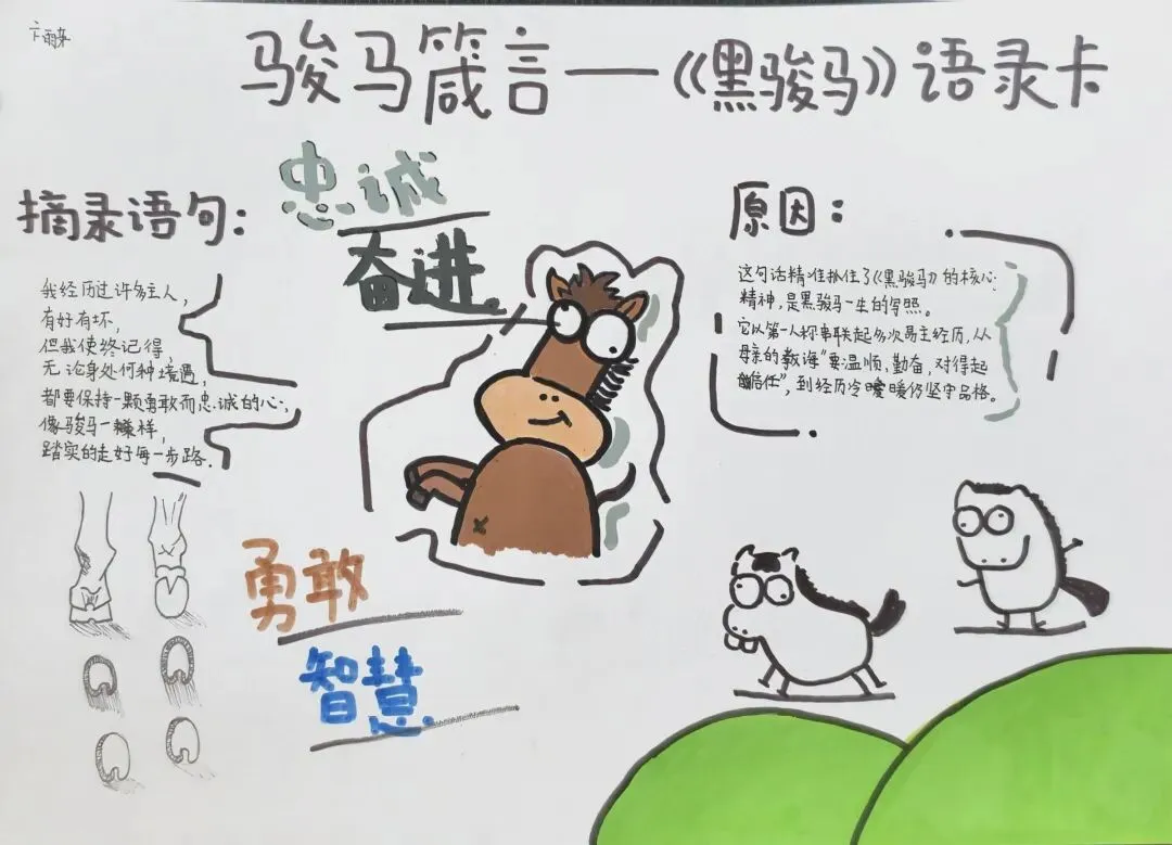 六年级的同学们在阅读《黑骏马》《鲁滨逊漂流记》等作品中摘录经典语句,写下真情感悟,制作成精美的语录卡片。他们从文字中汲取“坚韧不拔”“忠诚奋进”的力量,在感悟中坚定方向,将阅读所得内化为成长的养分。作品语言凝练、思想深刻,既体现了扎实的语文功底,更展现了积极向上的少年气象。