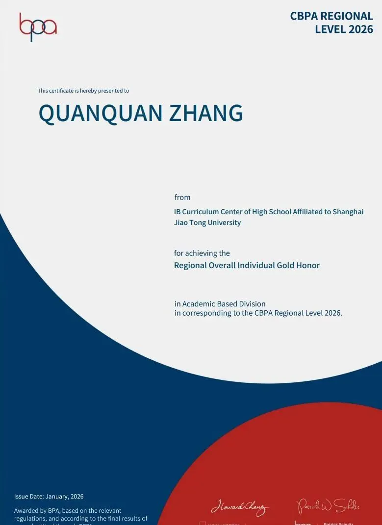 PIB3 张泉荃同学在全国总决赛中表现优异,成功晋级全球赛!此外,张泉荃同学此前已斩获上海地区赛金奖,展现了综合实力。