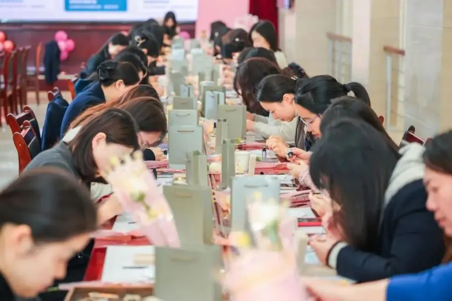 随后的非遗螺钿手作体验环节,女员工们在老师的指导下,将细碎的螺片一一镶嵌,打磨、拼接、点彩,指尖翻飞间,一枚枚独具匠心的胸针逐渐成形。现场气氛温馨而专注,大家互帮互学,在沉浸式的创作中,感受传统工艺的温度,也收获一份属于自己的节日礼物。