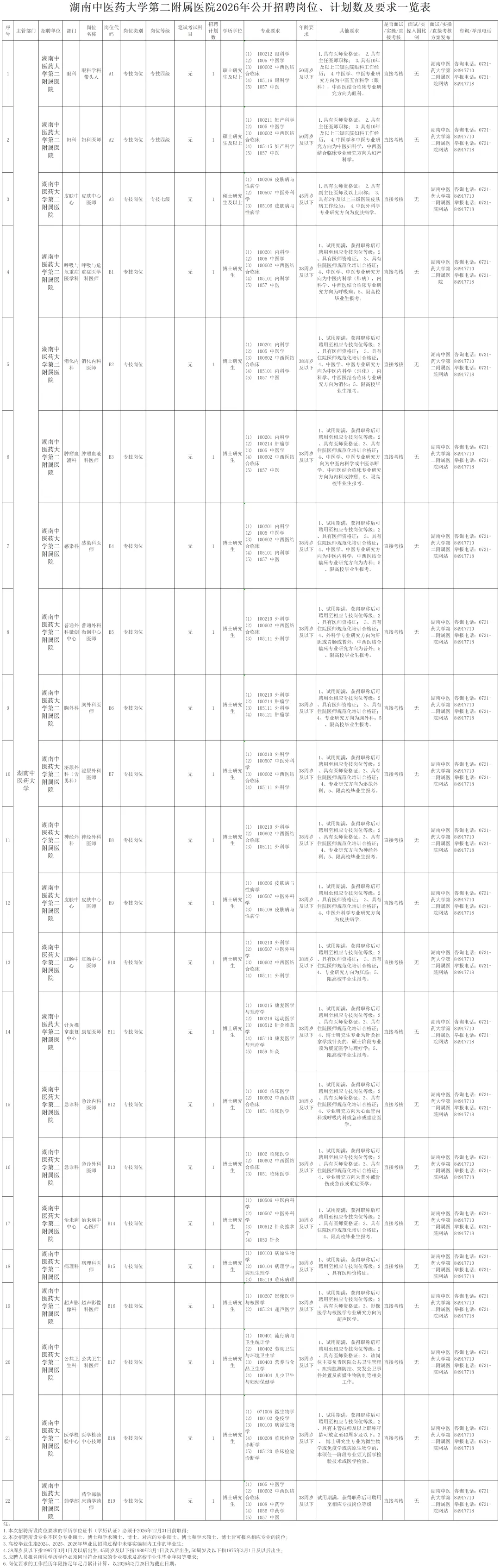 1.湖南中医药大学第二附属医院2026年公开招聘岗位、计划数及要求一览表