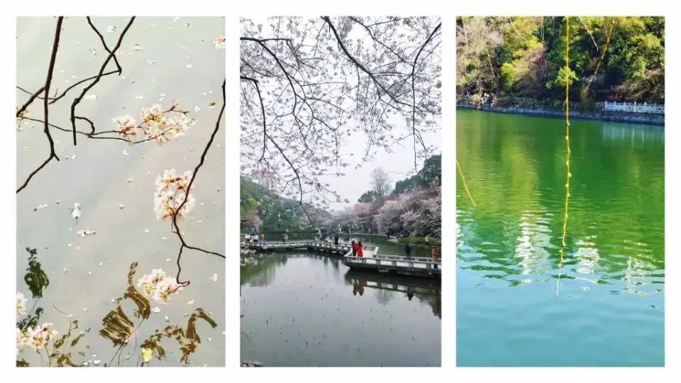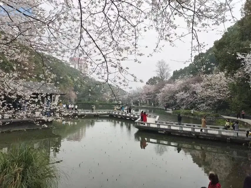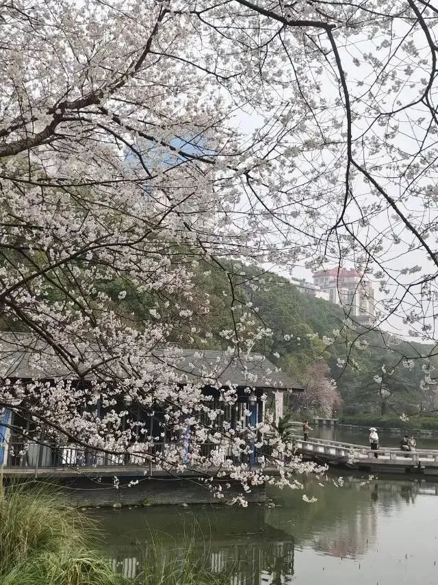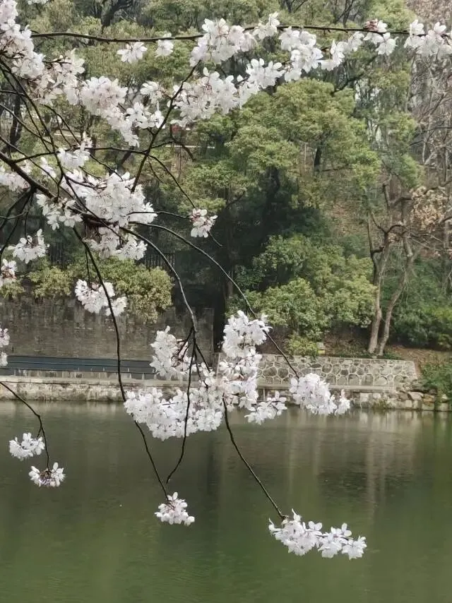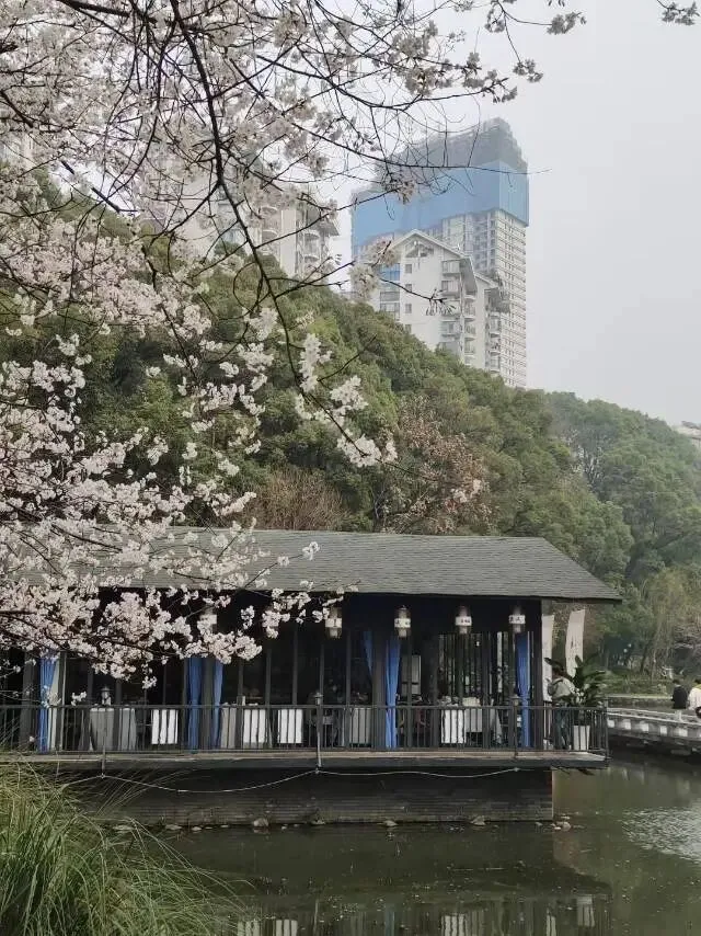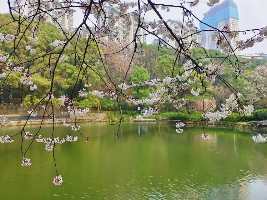 望月公园最特别的是公园内种植近300株本土山樱花,本土樱花比其他樱花花期早,在长沙还有点春寒料峭的日子里,山樱就早早盛开,远看像粉白色云朵,遇上春光明媚之时,游人如织,花瓣飞舞,很是美丽,而即使阴雨绵绵之时,樱花也在云雾细雨蒙蒙中更显得娇柔可人…