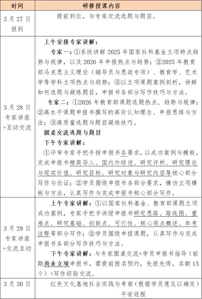 为进一步繁荣发展哲学社会科学,推进高校哲学社会科学扎根祖国大地,立足各省市区域经济、历史、文化及发展特色,构建中国哲学社会科学自主知识体系,提升广大科研工作者,尤其青年教师科研能力,教育部思想政治工作队伍研修中心拟于2026年3月27日-30日在长沙举办国家社科基金、教育部课题申报高质量撰写研修营,主要面向2026年国家社科基金、教育部人文课题申报,将邀请长期指导、经验丰富国家社科基金与教育部课题评审专家、985高校教授精准指导,以小班授课和学术写作工坊方式,手把手、全过程实战指导各类申报书高质量撰写,全面把握和领会课题申报思维与方法。现将有关事项通知如下: