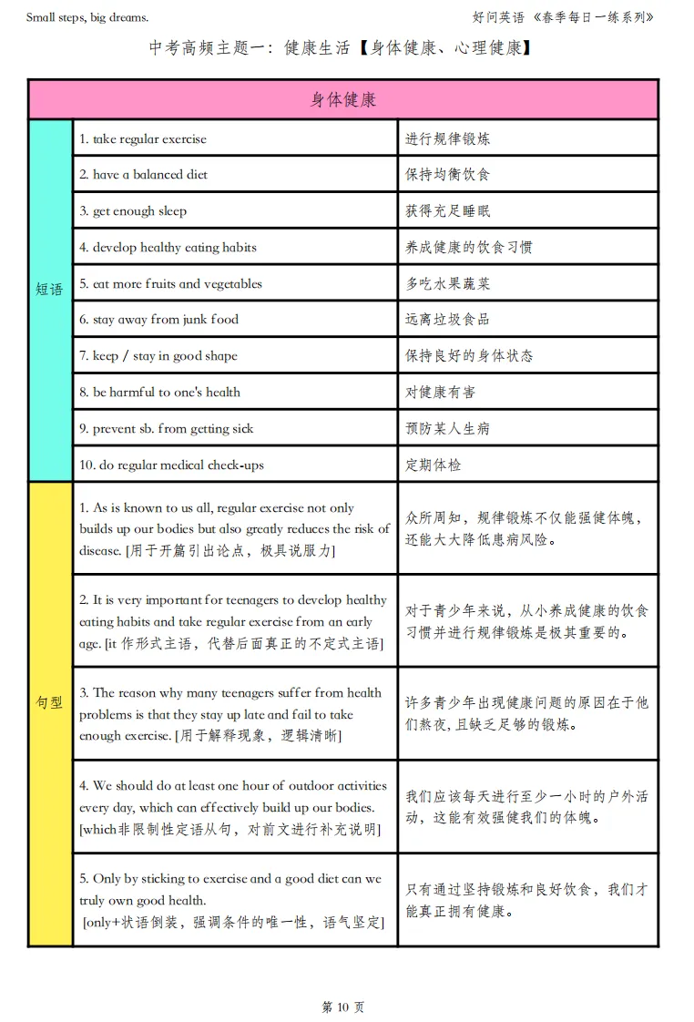然后,针对这十大主题,把对应的高频短语和重点句型全部整理好,每个句型都备注了用法场景,这样孩子看到的不是一堆长难句,而是”这句话在什么情况下用、为什么这么写"。