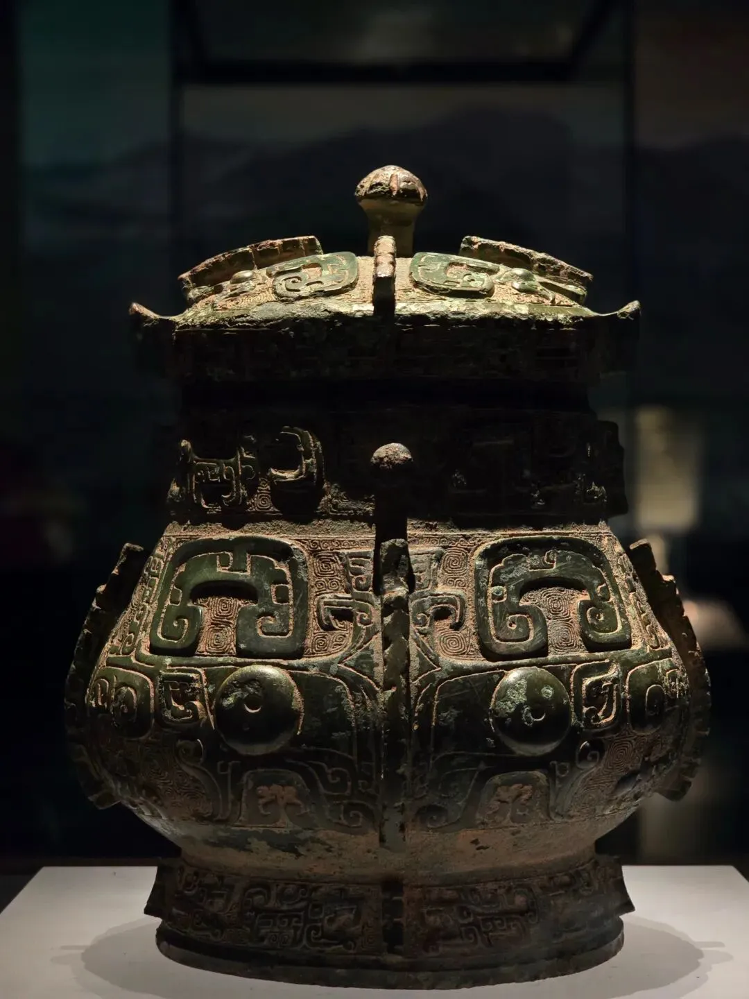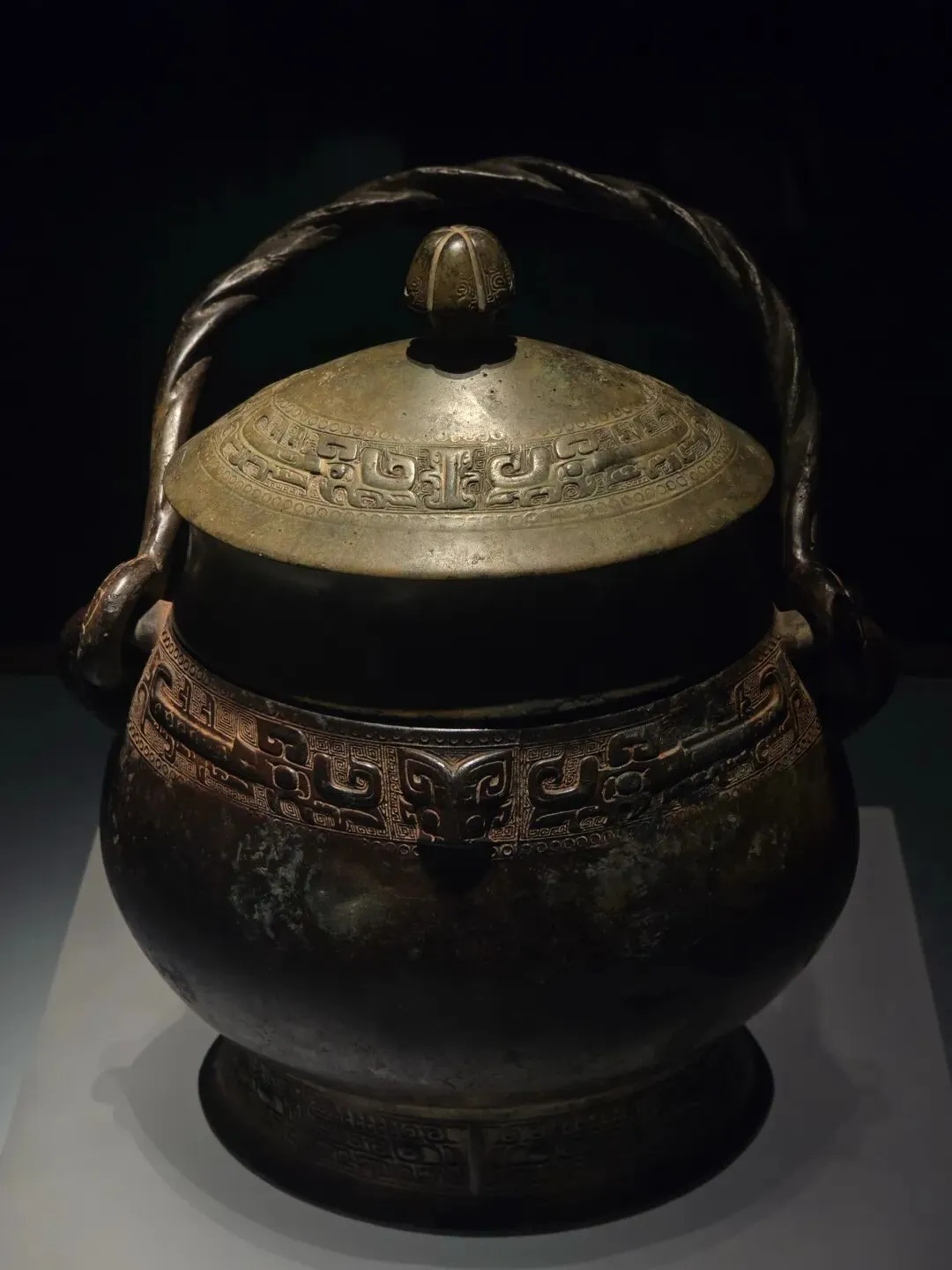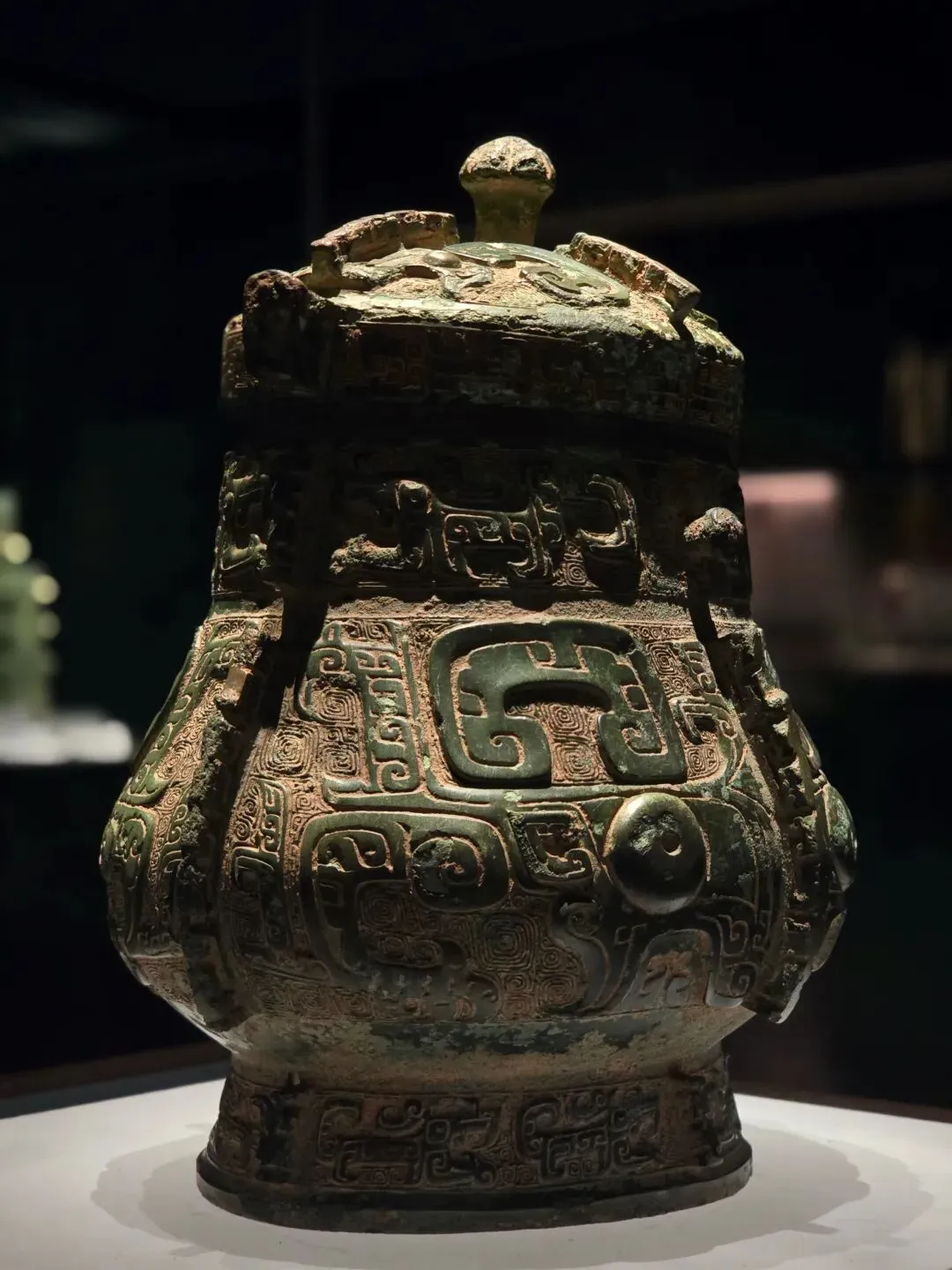 盛酒器。通体碧绿,隆盖,垂腹,矮圈足。盖顶铸有六瓣花蕾形提手,颈部纵向设置提梁。全器以细密的阴线云纹作地,盖面、颈部、腹部、圈足分别饰夔龙纹、兽面纹。器周饰四道扉棱。整器造型独特,纹饰精美,体现了商代高超的青铜铸造技术。