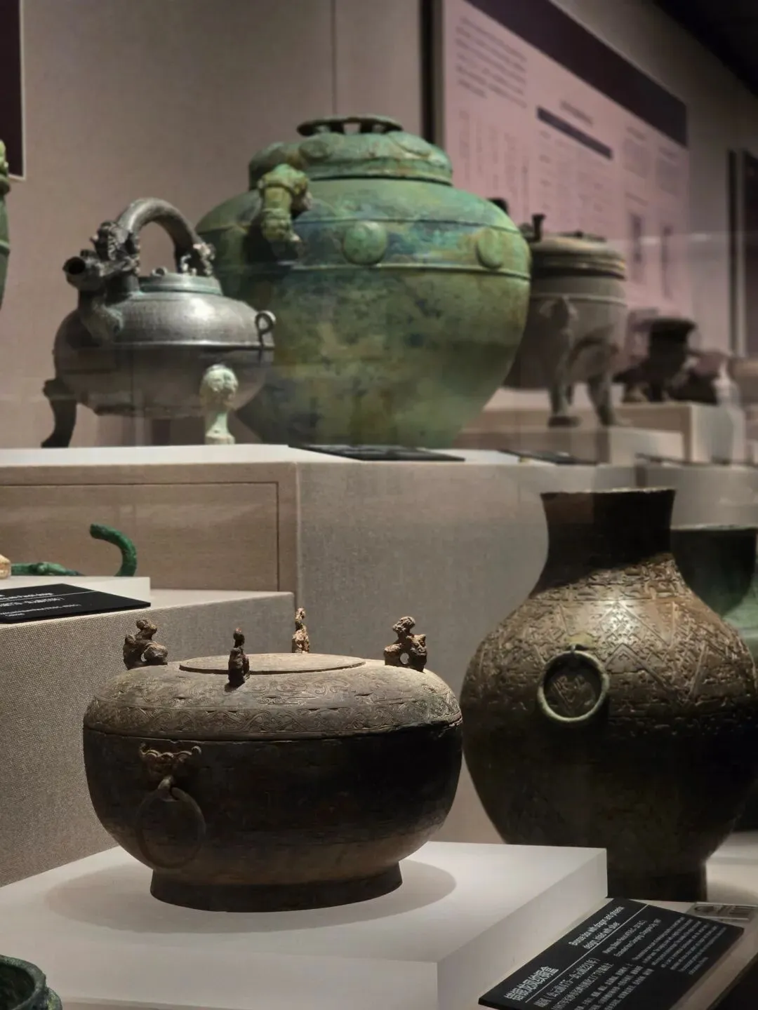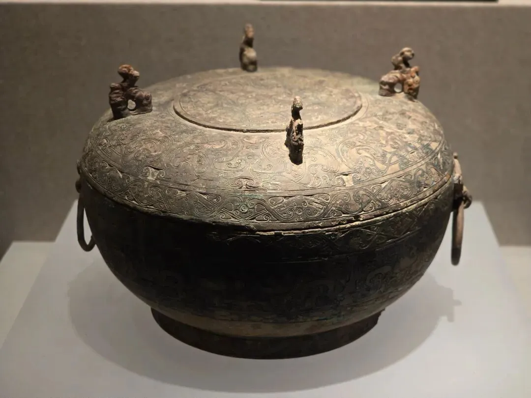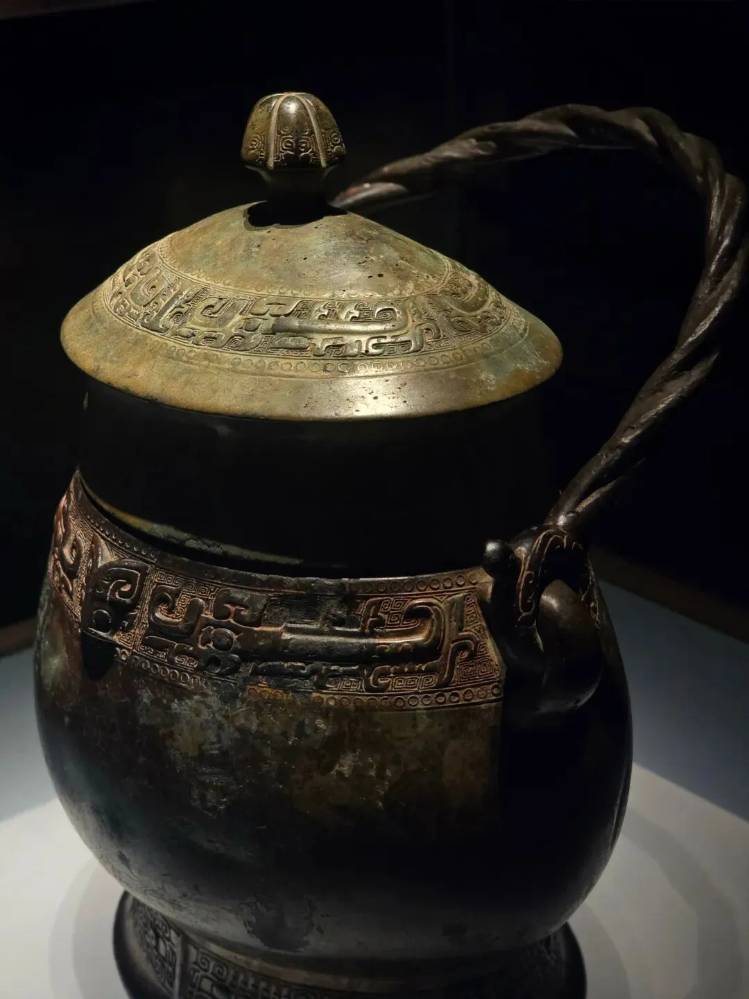 盛酒器。通体碧绿,隆盖,垂腹,矮圈足。盖顶铸有六瓣花蕾形提手,颈部纵向设置提梁。全器以细密的阴线云纹作地,盖面、颈部、腹部、圈足分别饰夔龙纹、兽面纹。器周饰四道扉棱。整器造型独特,纹饰精美,体现了商代高超的青铜铸造技术。