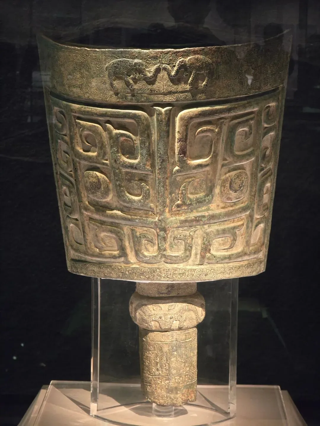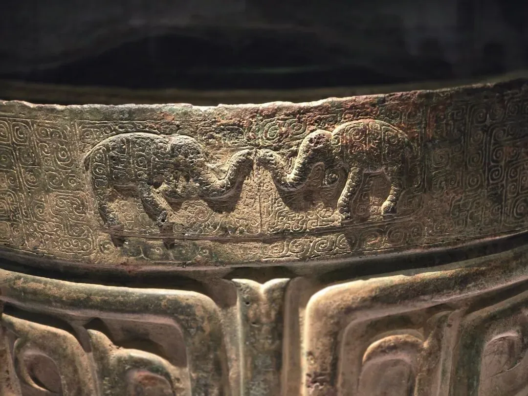 通高103.5厘米,重221.5千克。器身呈褐绿色,钲部作合瓦形,上宽下窄,甬呈圆管状,与钲腔相通。钲面饰有以粗线条组成的兽面纹,左右两侧对称,半浮雕两眼略微凸出,上刻云雷纹。燧部浅浮雕一对相向站立的大象,钲之周边、甬部满饰有云雷纹。形体高大,气势恢宏,是迄今为止我同发现的商代铜饶中最大的一件。