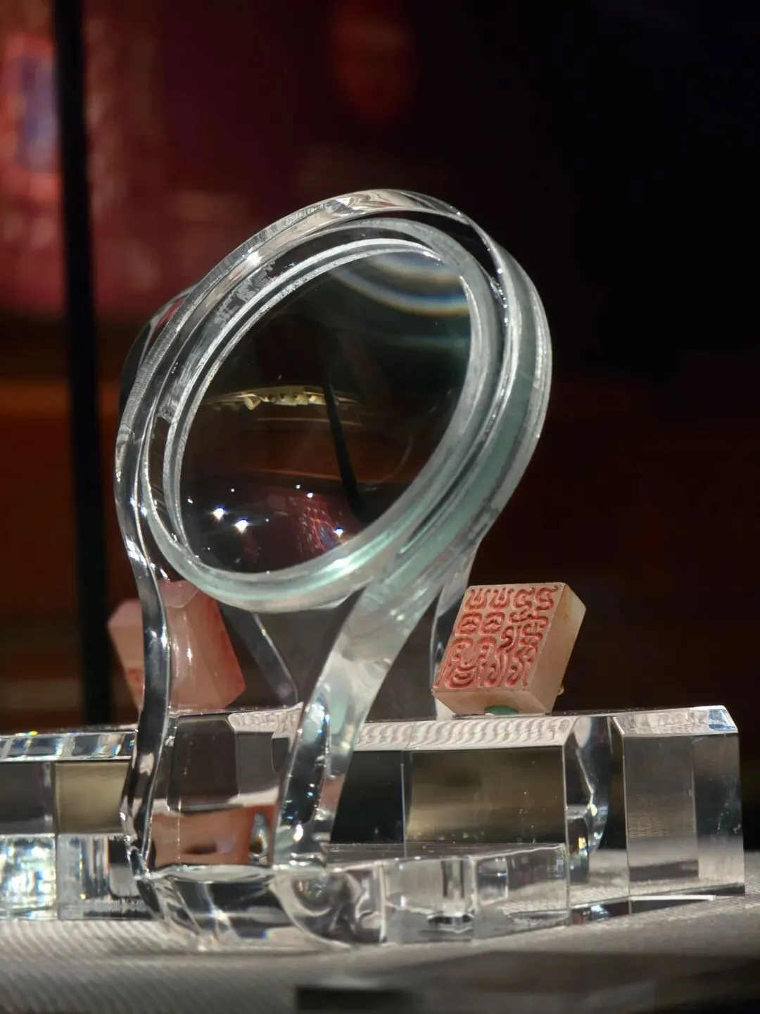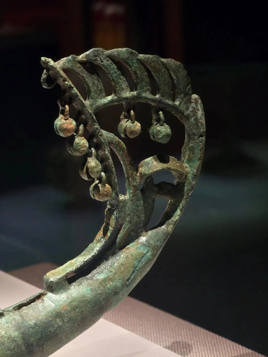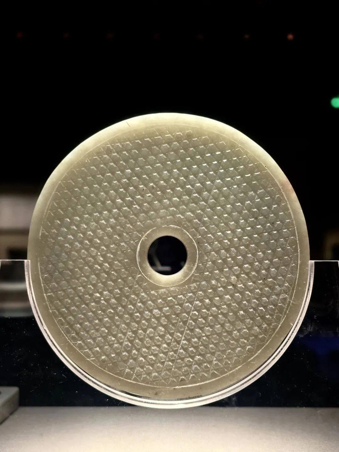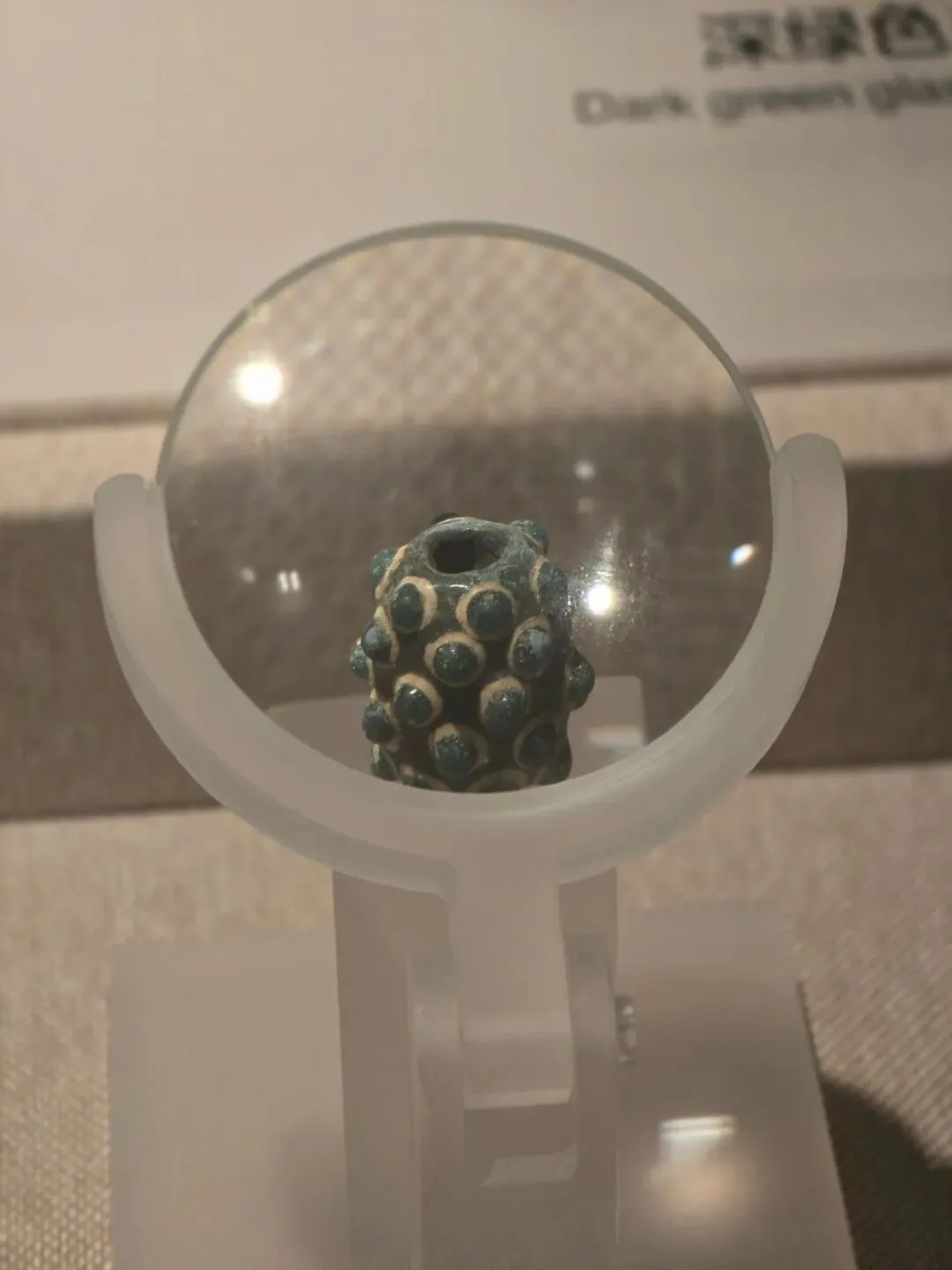 琉璃器,也称料器,最早产于西亚和埃及。特别是这颗战国三十眼琉璃珠呈圆管状,通体呈绿色中间有圆孔可以穿绳佩戴,器表突出30个半球形颗粒,颗粒底部饰白色圆圈,状似蜻蜓眼,该器物形体硕大,为同时期的琉璃珠中所罕见。
