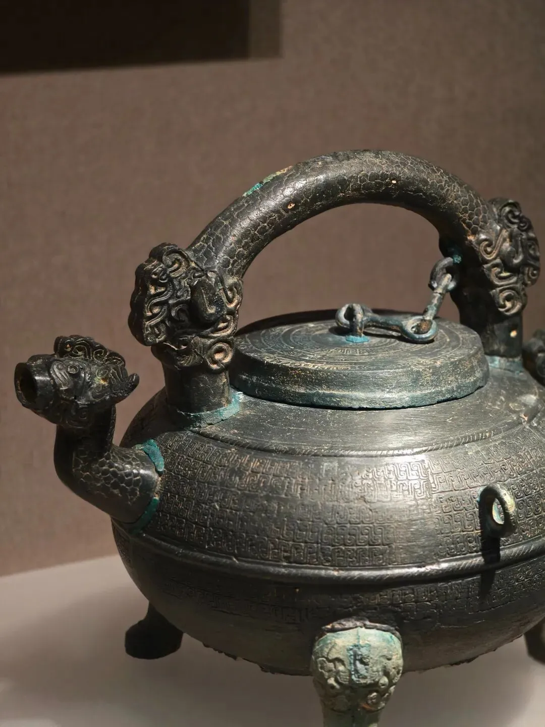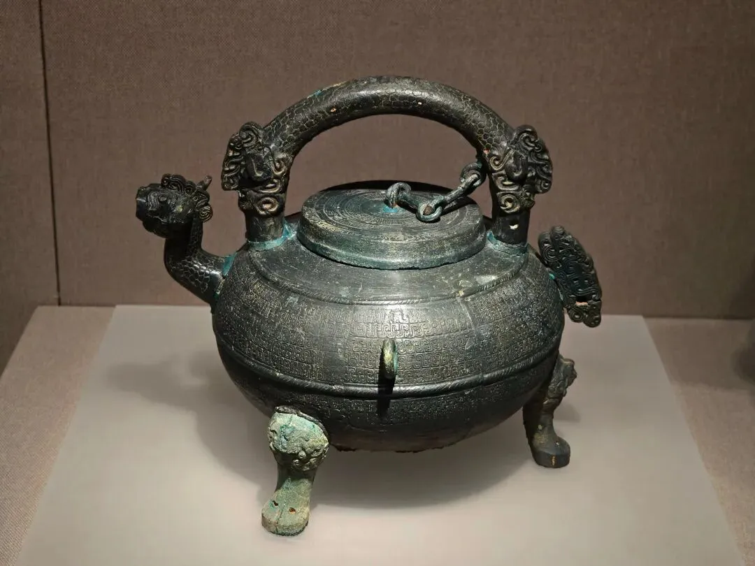 酒器。圆口,圆腹,三蹄足。提梁为双脊龙形,一端与盖顶以链连接,流呈龙首状。身通体装饰S形云纹。