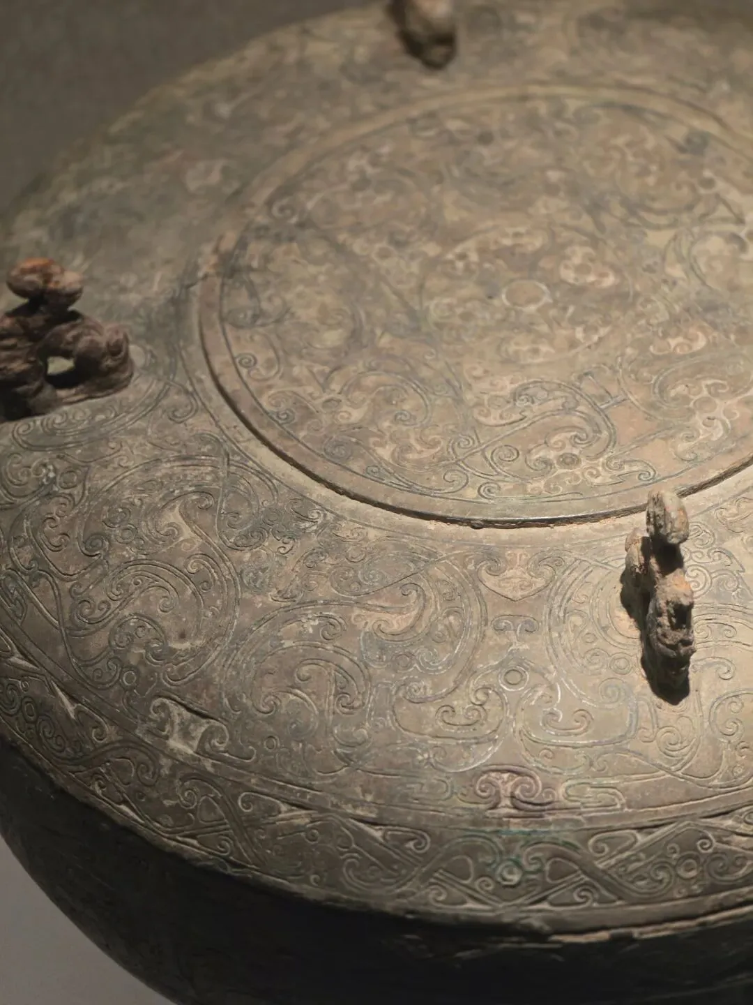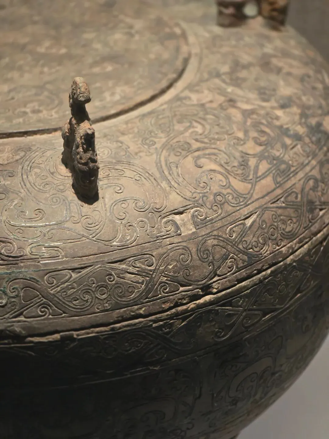 容器。子母口,弧腹,圈足。盒盖隆起,顶部稍平,上立四兽形环钮。口沿外侧对称各饰一兽衔环铺肖。通体饰错银卷云纹、变体龙凤纹。纹饰繁复精美,线条流畅,制作精细节。