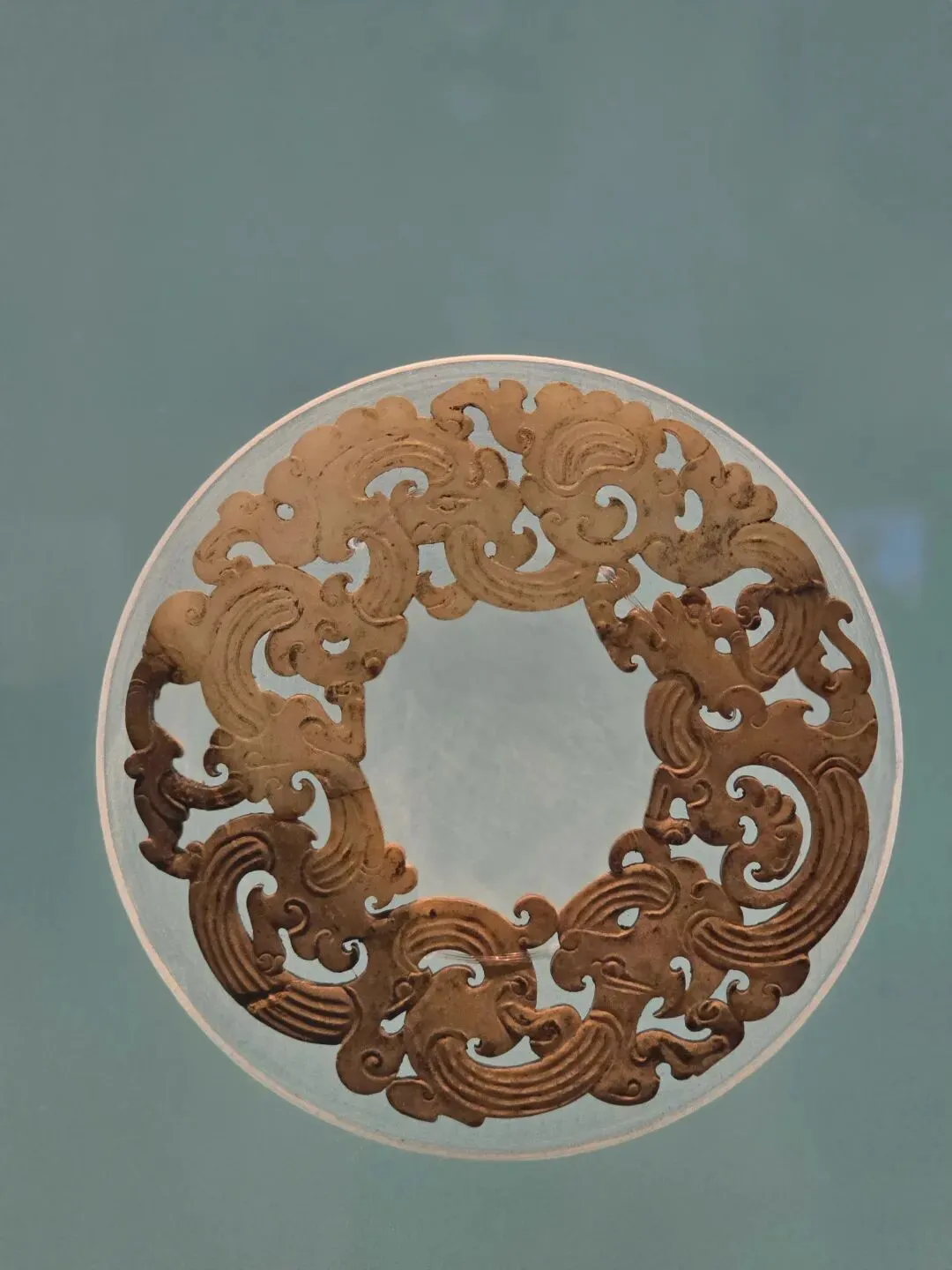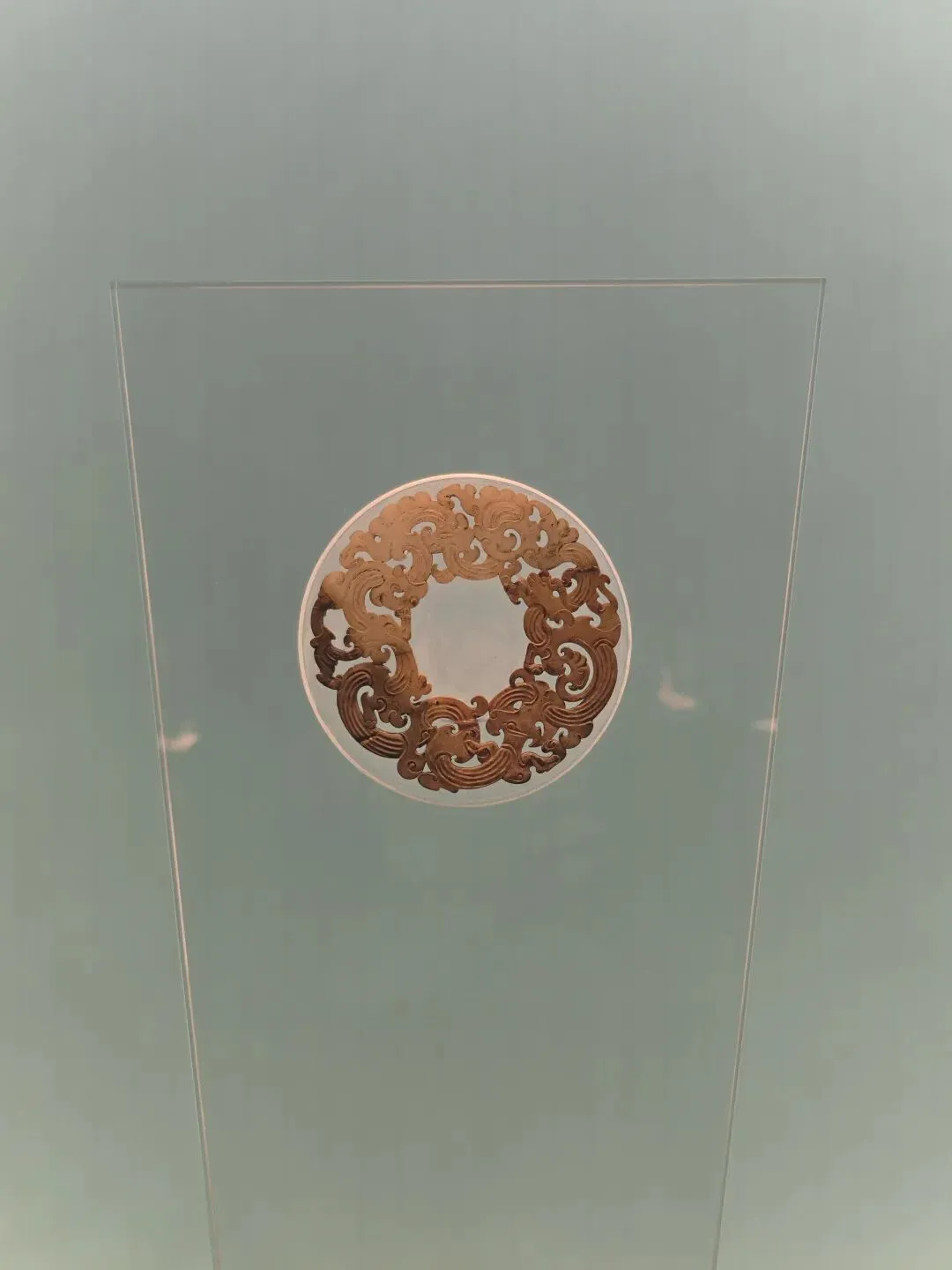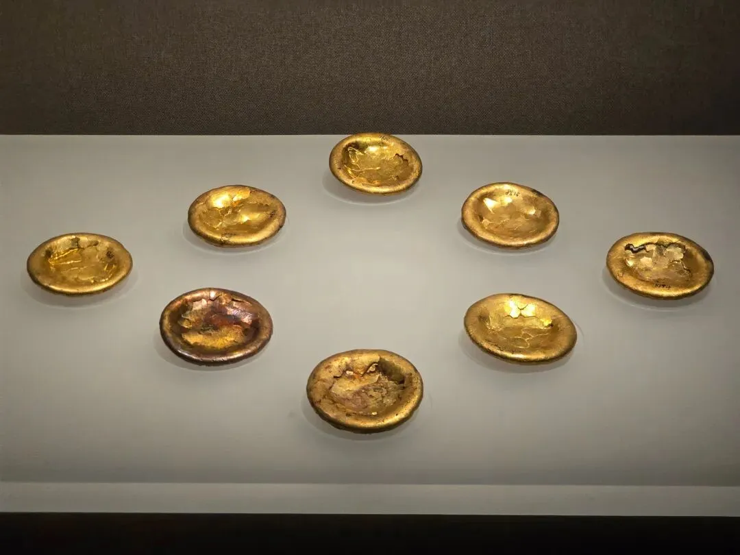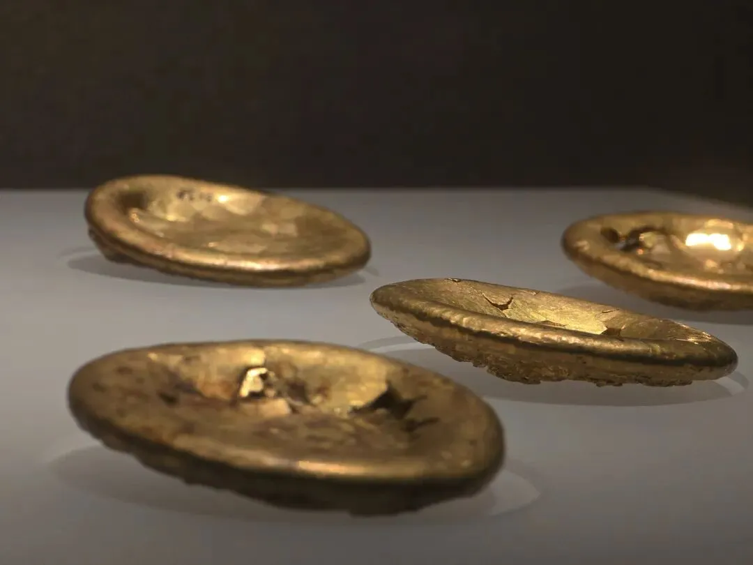 “曹(女巽)”为西汉吴氏长沙国王后,这枚印章为王后私印。玛瑙质地,印面呈正方形,边长1.85厘米。二台式覆斗纽,纽上有鼻穿,印鼻穿系以绳索状黄金丝环。印面阴刻鸟虫篆文“曹娱”二字,字体华丽婉转,圆润秀雅。玛瑙质地,二台式覆斗纽,上有鼻穿。印面阴刻篆文“妾(女巽)”二字。字体端庄整饰、刚劲有力,布局匀称妥帖,是汉印中的经典之作。圆饼形,正面光滑内凹,上有裂纹,边侧錾刻“V”形符号,背面粗糙呈蜂窝状。每枚金饼直径约 6.4 厘米、高 1.2 厘米,重 250 克左右,相当于汉制的一斤。此类金饼为长沙王在宗庙祭祀时上贡的黄金,又称“酎金”。青白色,局部有黄色、黑色沁。双面透雕曲缠盘绕变体飞龙,环周饰以流动飞卷的云气纹和凤鸟纹,给人以龙腾凤舞、云卷云舒之动感。龙凤身躯上以浅浮雕随形琢出隐约的线条,更加增强了整器的艺术效果。该环雕琢刀法娴熟圆润,线条舒展流畅,构思巧妙,制作精美,反映了西汉前期高超的玉雕技艺。凤尾铜灯