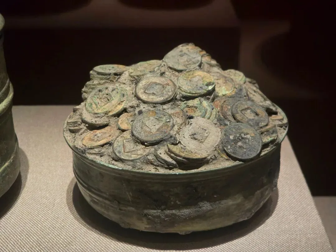 口微侈,通体素面,腹中部有微折,下腹部略圆。碗内装盛“五铢”铜钱,呈现出满溢的状态
