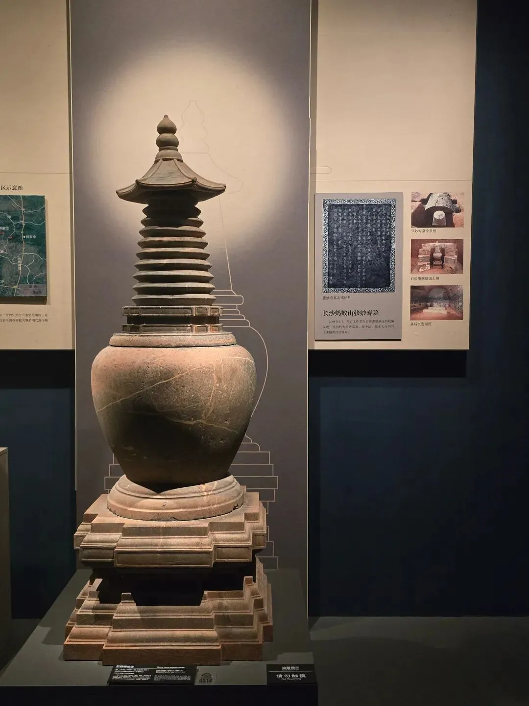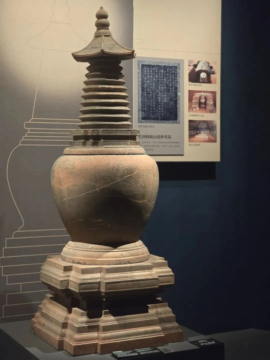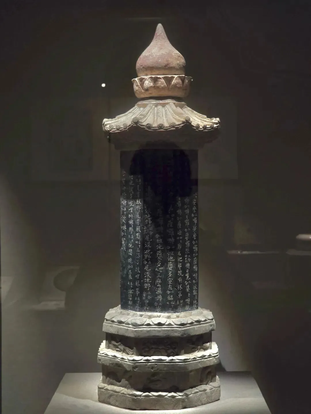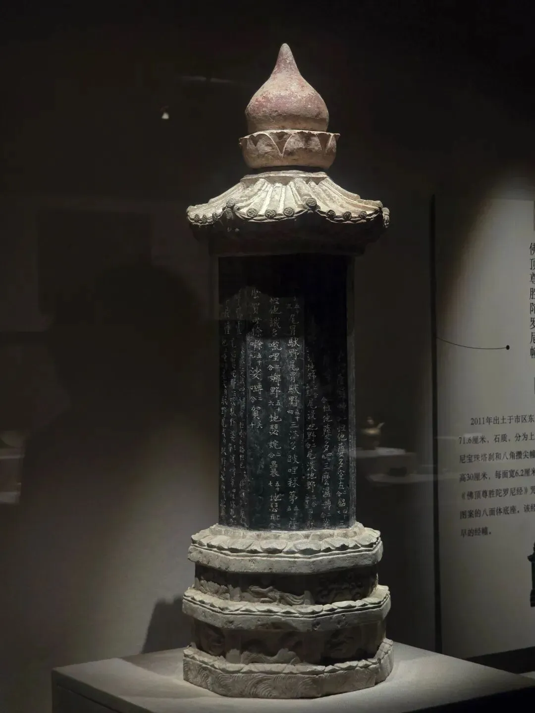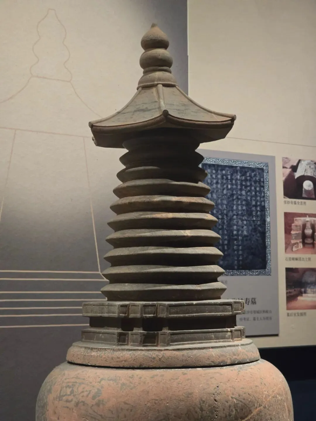 通高156厘米,由塔顶、相轮、覆钵、基座相互套接组成,各部分扣接严实,造型别致。此塔出土时置于墓葬的墓道中,塔中放经箱,内存《金刚般若波罗蜜经》《太上洞玄灵宝高上玉皇本行集经》等佛教、道教经书。