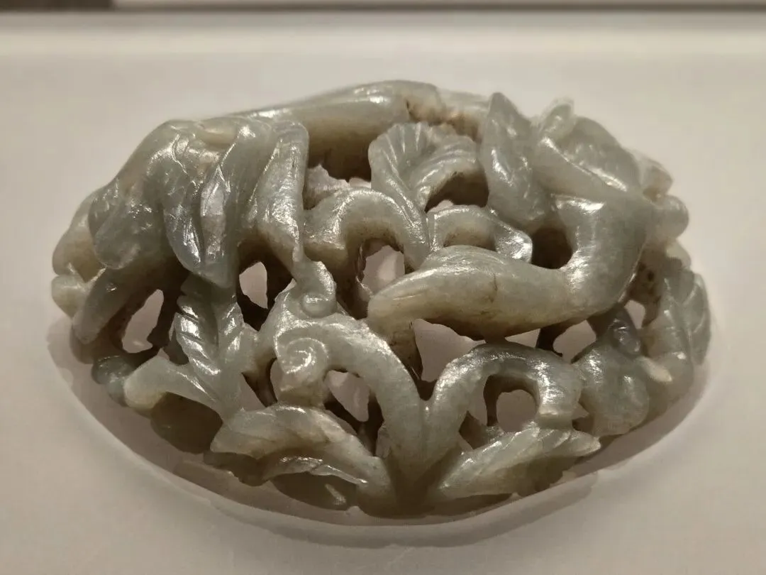 透闪石软玉,色泽白润晶莹,包浆醇厚。器物采用辽金时期春水玉的经典构图,运用元代多层镂雕的典型工艺,雕琢了荷莲、水草,以及两只引颈展翅、翩跹其上的天鹅,塑造了北国春天生机勃勃的景象。整器刀法洗练、层次丰富。雕琢对象的瞬间情态处理得惟妙惟肖,可谓形神兼备,具有明显的元代玉器特点。