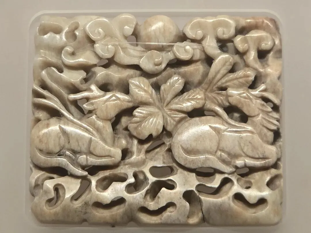 透闪石软玉,扁体长方形,色呈灰褐色。镂雕雌雄两鹿俯卧于山石之上,相互凝视,尽显脉脉含情之态。两鹿上方镂雕如意云纹,其间又以柞树妆点,描绘了一幅北国秋天的景象。器物为经典的秋山题材,具有典型的辽金时期风格。