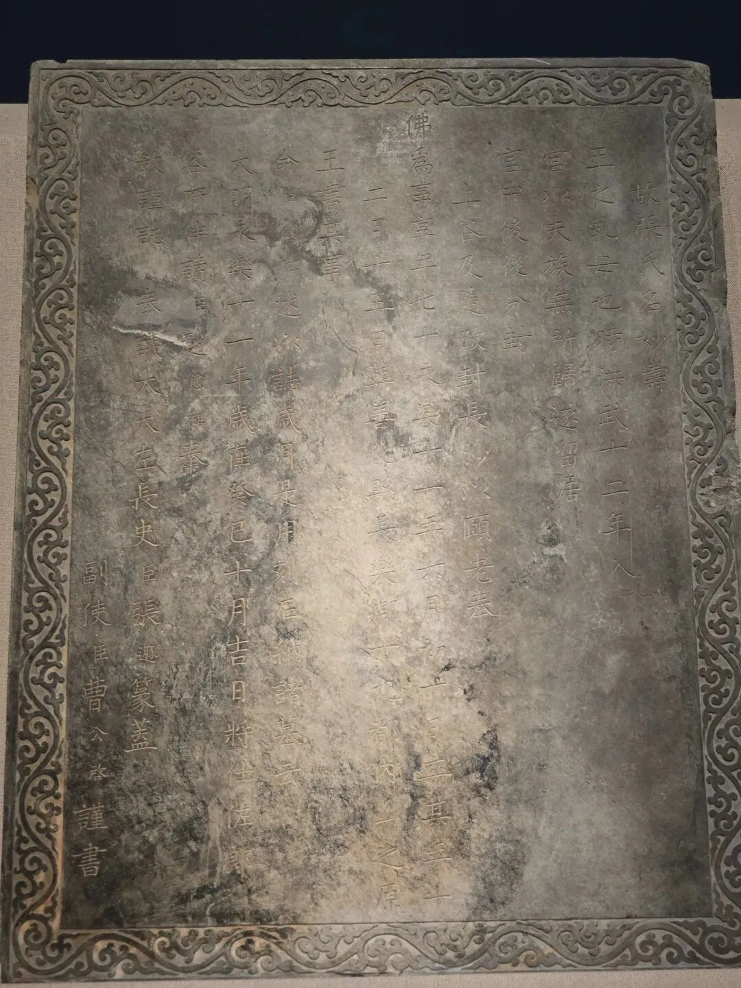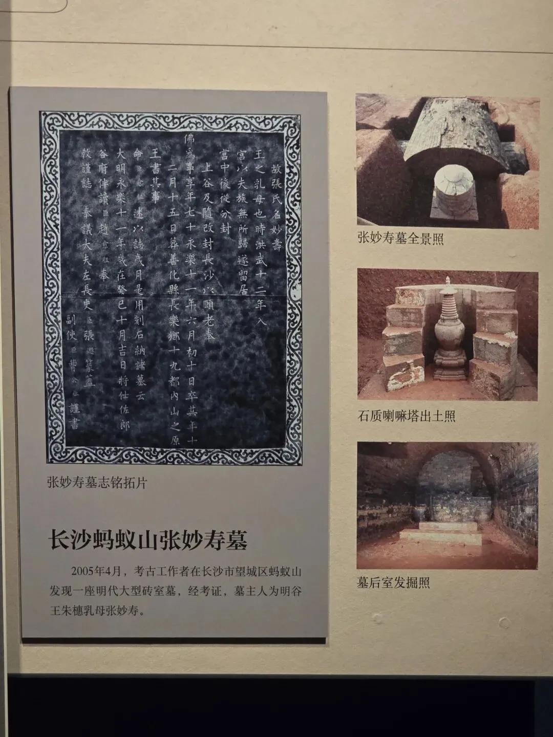 石质,长方形。表面光滑,四周沿沿雕刻花纹,正面楷书铭文。根据墓志铭载,墓主张妙寿,是明代谷王乳母,于洪武十二年(1379)入皇宫,追随谷王先后至上谷和长沙,永乐四年(1413)逝,享年70岁。