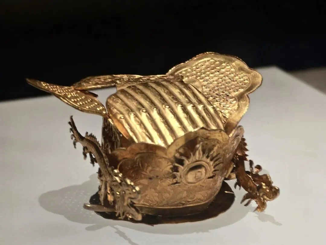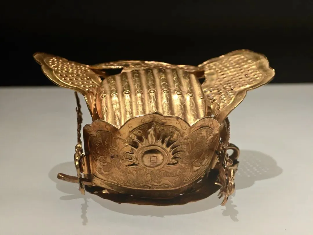 分前、后、顶、底四部分。前片作半圆花瓣形,与底座肩插套合,表面錾刻缠枝牡丹花纹,中间缀饰一颗火焰宝珠,珠上刻一“日”字,左右两侧各缀一行龙。后片与底座焊接相连,下部镂空并錾刻缠枝牡丹花纹。顶片呈圆形,錾刻缠枝牡丹花纹和曲点纹。器形小巧,玲珑精致。此冠据传早年出土于长沙县跳马涧,或与明藩王有关。