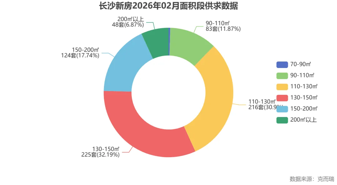 从面积段成交数据看,2月成交房源中130至150平方米(建面)和110至130平方米(建面)成为主力,占比合计达63%。这说明改善型需求主导市场,但总价控制仍是关键考量。