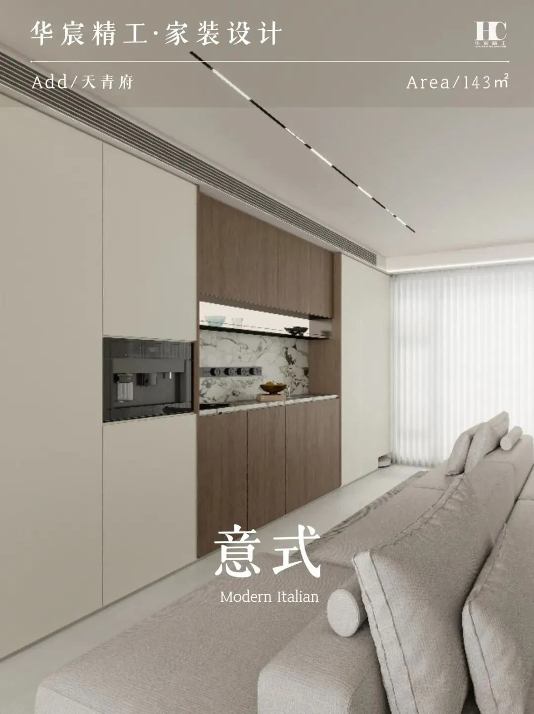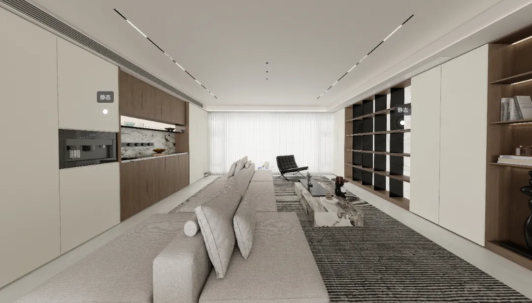 ▶ 客厅:无主灯设计 + 浅灰布艺沙发,搭配整墙收纳柜,把天青府的 “低密舒展” 搬进▶ 室内,光影与氛围感拉满。