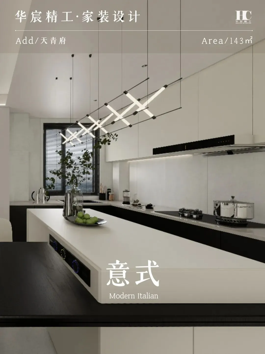 ▶ 厨房:黑白岩板中岛 + 嵌入式电器,呼应项目 “改善人居” 的定位,下厨也成享受。