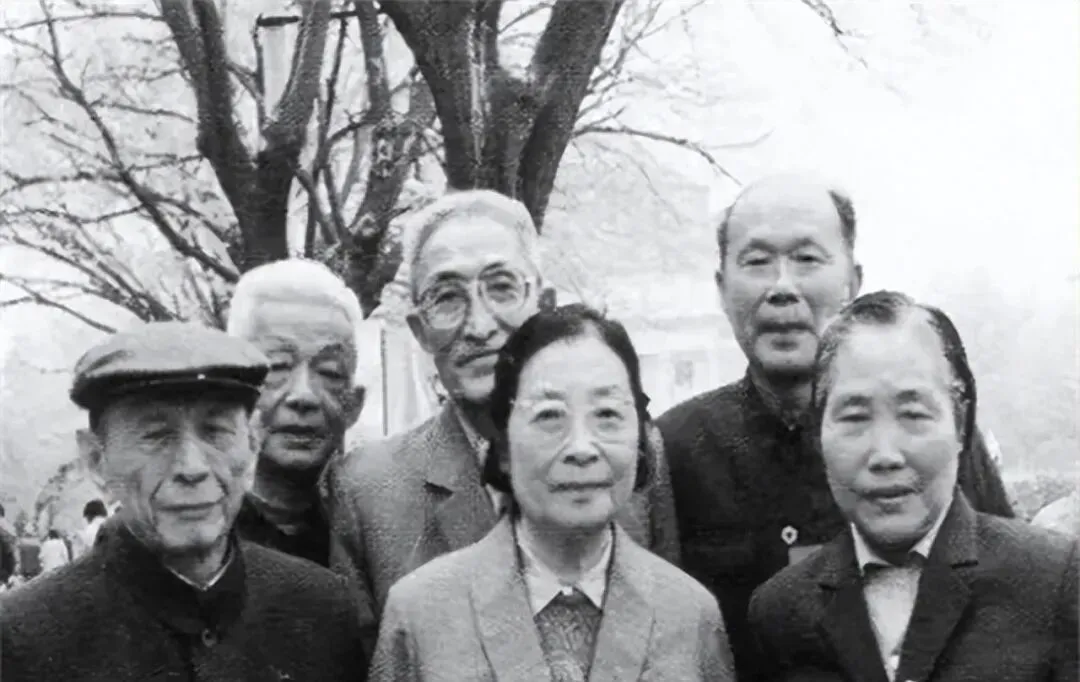 1990年陈舜瑶与清华1936级土木系同学合影。前排左起:徐元冬、陈舜瑶、谢文(徐夫人);后排左起:李舜英、丁永龄、周元青