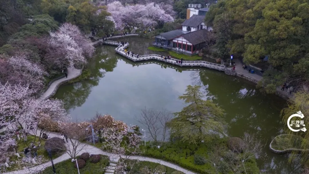 作为一座集自然生态、文物保护、运动休闲于一体的汉文化主题公园,望月公园总面积约235亩,园内的樱花树近300株,汇聚了山樱花、吉野樱、寒绯樱、晚樱等多个品种。其中最具特色的当属本土山樱花,这可是湖南唯一培植出的本土樱花品种,它们主要分布在铜盆湖湖畔、玉璧广场、汉乐区附近,粉白的花朵沿着湖岸铺展开来,为古老的公园增添了一抹灵动的春色。