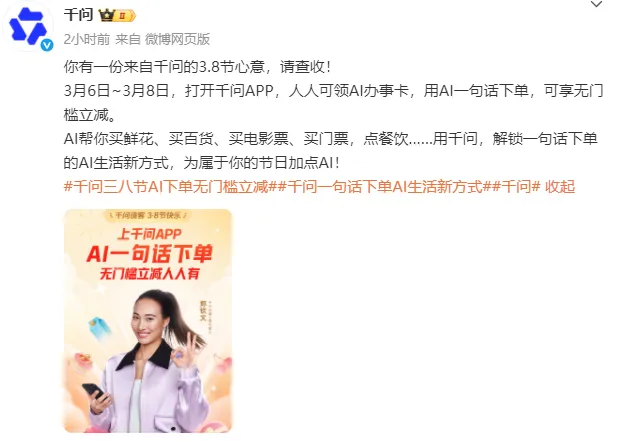 家人们速冲!阿里旗下千问APP放大招了🔥 3月6日下午,正式上线妇女节专属请客活动,宠粉不玩套路,实打实的无门槛立减福利,错过真的要等一年!