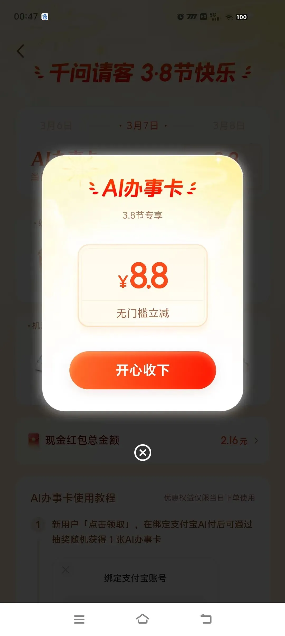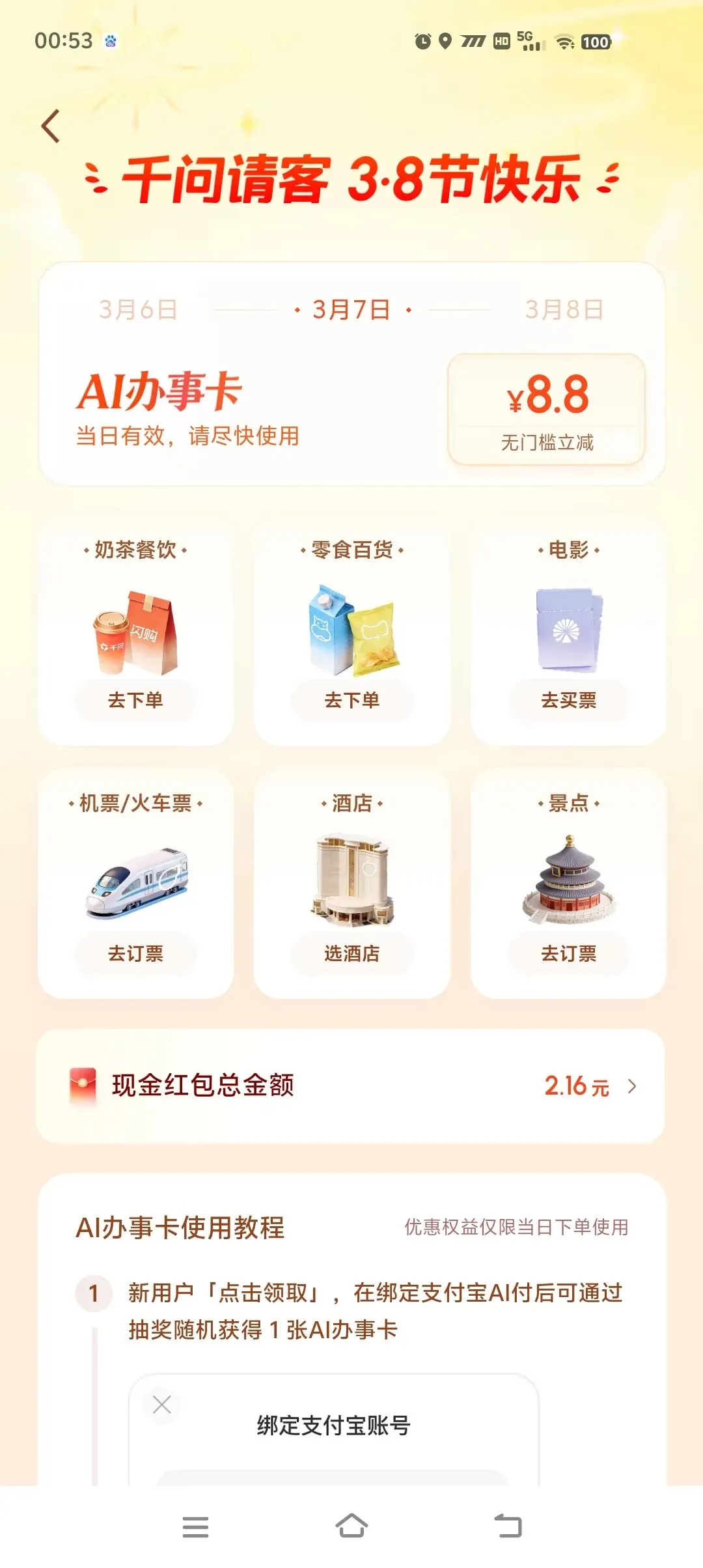 划重点!活动时间从3月6日14:00持续到3月8日23:59,整整3天狂欢,每天都能抽福利!无需复杂操作,打开千问APP,点击首页左上角【千问请客】入口,一键参与抽奖,就能免费领取“AI办事卡”(优惠券)。(3月7日领到8.8元优惠券,待使用)