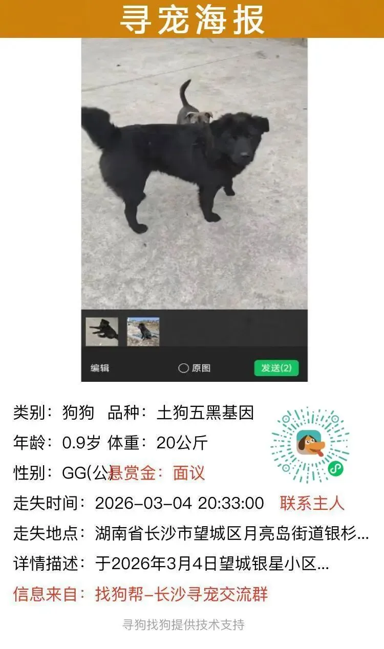 #长沙寻狗# 望城区月亮岛街道银杉路银星苑附近走失一只土狗五黑基因,如有好心人看到或者收留请联系主人或本平台