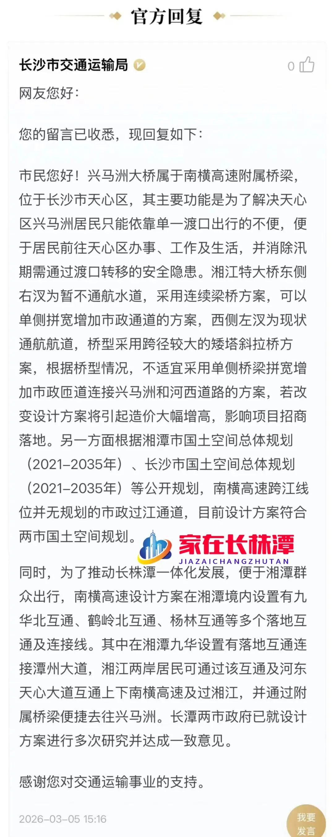为了推动长株潭体化发展,便于湘潭群众出行,南横高速在湘潭九华设置有落地互通连接潭州大道,两岸居民可通过该互通及河东天心大道互通上下南横高速过江,同时便捷去往兴马洲。感谢您对交通运输事业的支持。