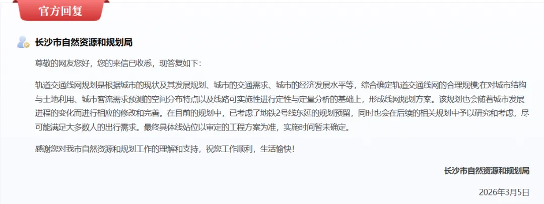 轨道交通线网规划是根据城市的现状及其发展规划、城市的交通需求、城市的经济发展水平等,综合确定轨道交通线网的合理规模;在对城市结构与土地利用、城市客流需求预测的空间分布特点以及线路可实施性进行定性与定量分析的基础上,形成线网规划方案。该规划也会随着城市发展进程的变化而进行相应的修改和完善。在目前的规划中,已考虑了地铁2号线东延的规划预留,同时也会在后续的相关规划中予以研究和考虑,尽可能满足大多数人的出行需求。最终具体线站位以审定的工程方案为准,实施时间暂未确定。