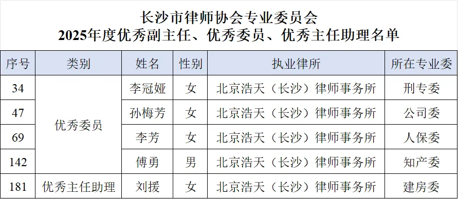 2026年3月6日,2025年度长沙市律师协会区县(市)律师工作委员会、专门专业委员会优秀主任、优秀副主任、优秀委员、优秀主任助理名单公布。我所合伙人李冠娅,资深律师孙梅芳、李芳、傅勇、刘援凭借扎实的专业素养及突出的工作成效,分别荣获“优秀委员”、“优秀主任助理”称号。