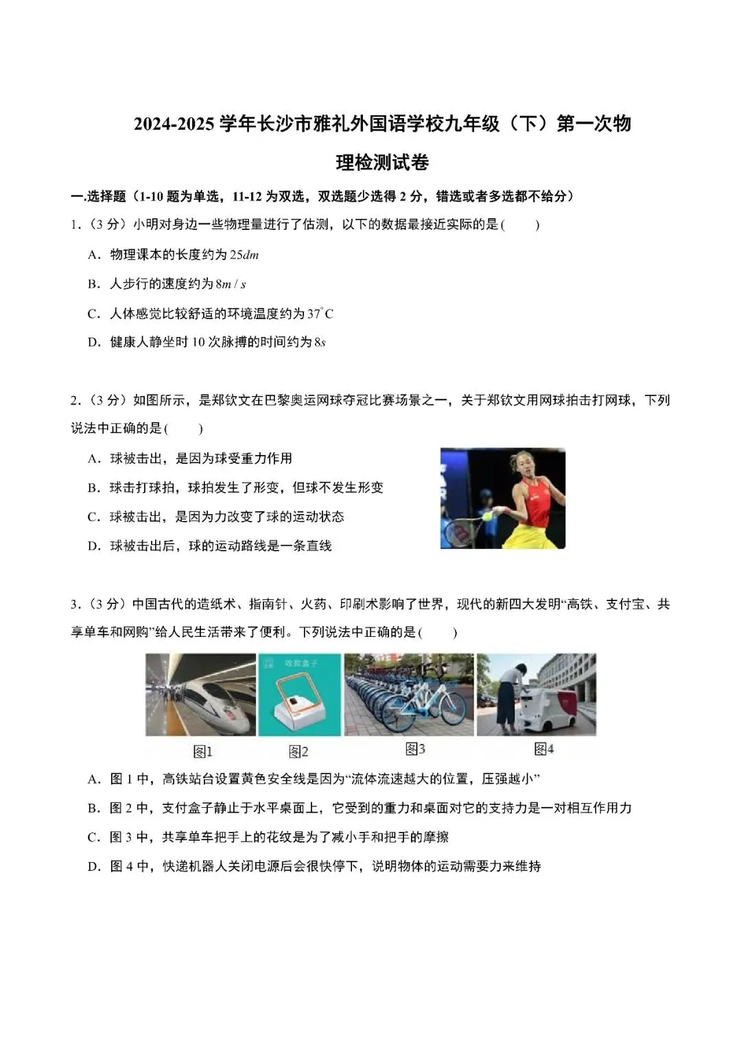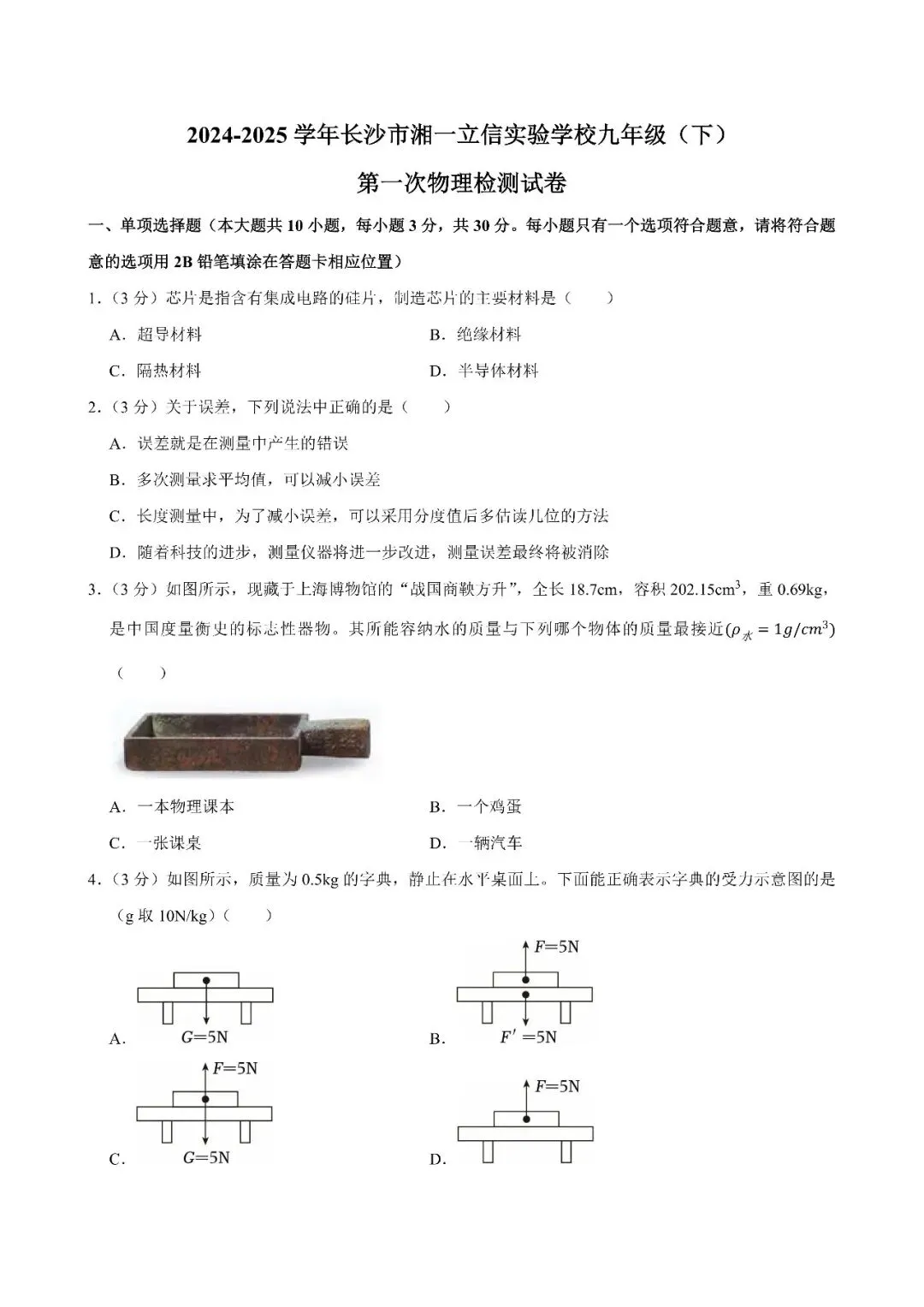【真题汇总】——长沙八年级下册入学检测物理试卷+参考答案(免费领取)
