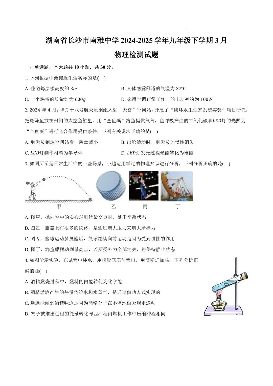 【真题汇总】——2024年长沙九年级下册入学检测物理试卷+参考答案