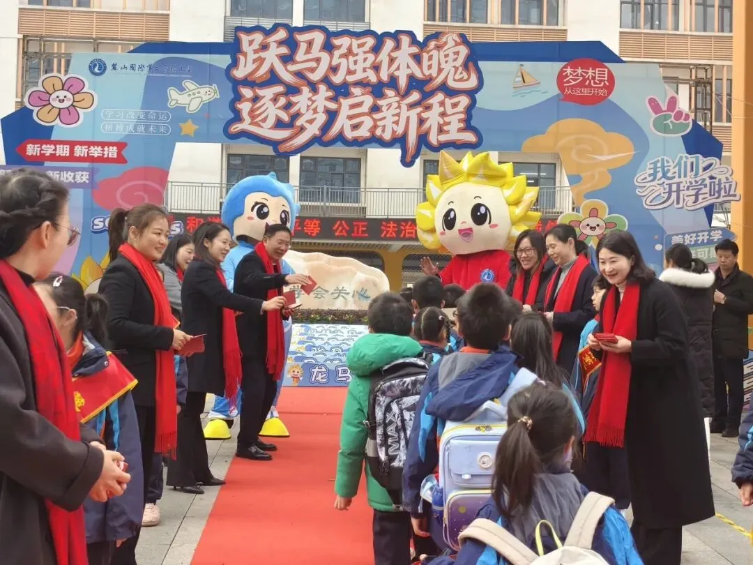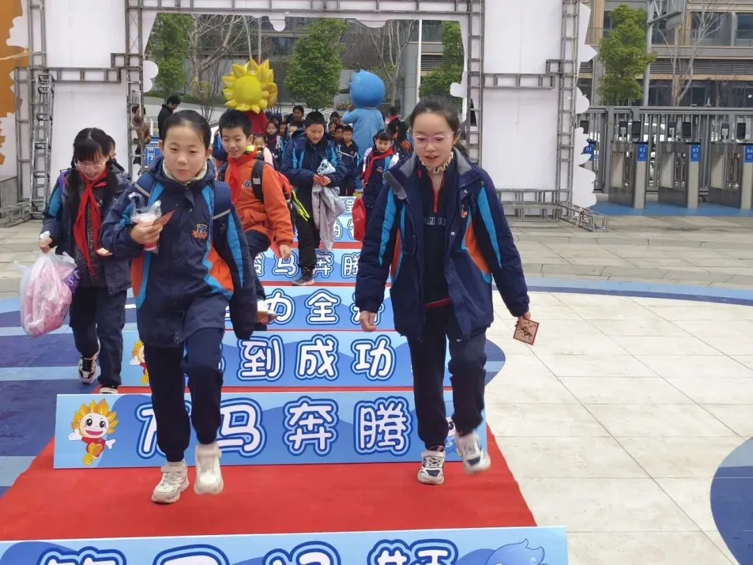 3月4日清晨,校园里处处洋溢着喜庆的迎新氛围。校门口,“跃马强体魄 逐梦启新程”主题拱门醒目矗立,校园吉祥物麓儿、山娃在两侧挥手致意,身着整齐服装、佩戴红围巾的学校领导与行政团队早早守候在红毯旁,用温暖的笑容迎接每一位“麓娃”归巢。孩子们背着新书包踏过红毯,清脆的问候与欢笑声交织成动听的开学乐章。红毯上,“以梦为马”“万马奔腾”等马年主题指引牌依次排开,孩子们在打卡点驻足留念,一张张笑脸定格成新学期最美的瞬间。