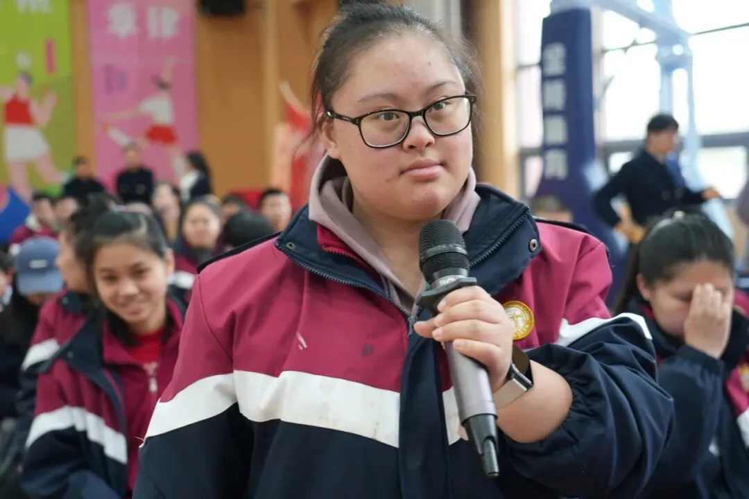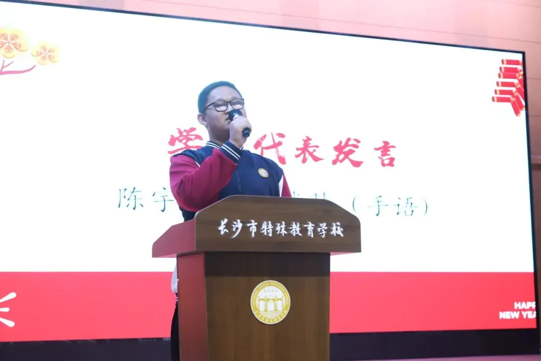 中专部学生代表陈宇轩登台发言,以自身成长经历诠释“精进・自强”的精神。他的故事展现出特殊少年不畏挑战、向阳而生的坚韧力量,令在场师生深受感染。