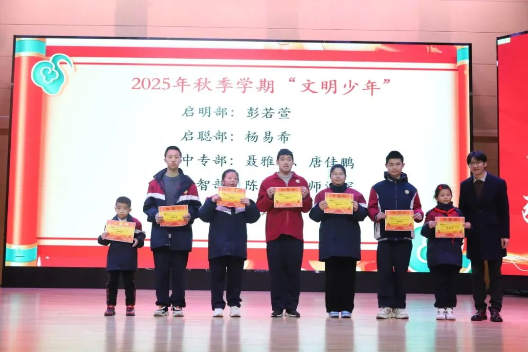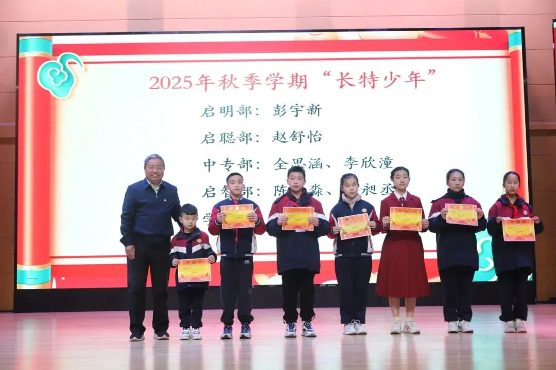 学校党委副书记、校长王磊宣读了2025年秋季学期文明少年、书香少年、长特少年、文明班级的表彰决定。校领导为获奖学生和集体颁发荣誉证书,掌声与喝彩声此起彼伏,激励全体师生新学期奋勇争先、笃行不怠。