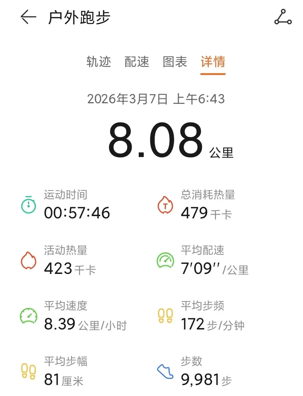 今天早上本来定了慢跑10公里的目标,最后只跑了8.08公里。