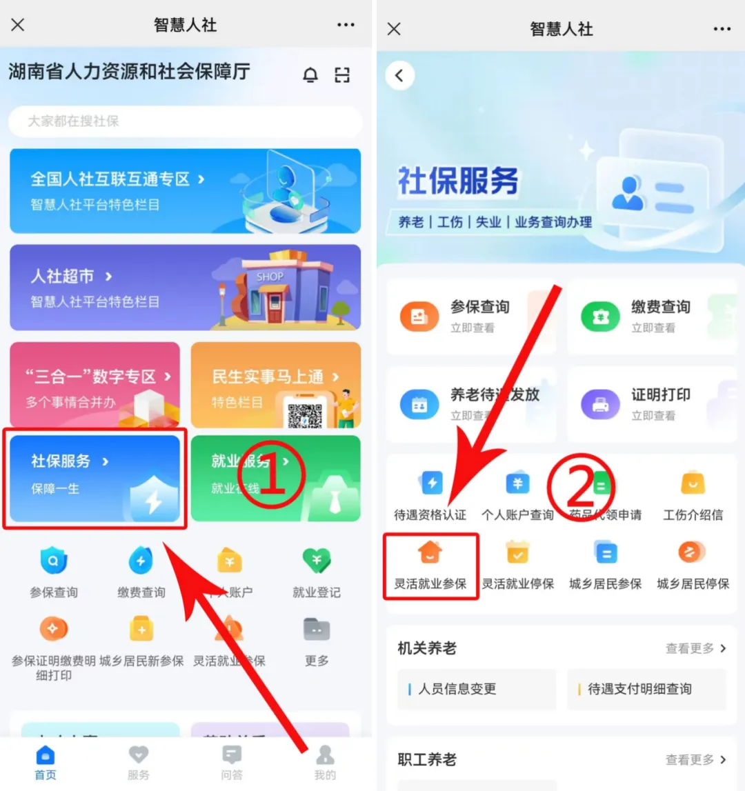 登录“湘税社保”APP或小程序,选择“灵活就业养老缴费”模块,选择“灵活就业人员养老保险”,如实填写相关信息(如身份证号、姓名)完成费用缴纳。