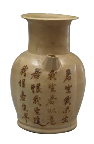 青釉“君生我未生”瓷壶,唐朝文物,通高17.6厘米,口径8.9厘米,底径9.6厘米。长沙窑窑址出土。长沙窑瓷器大量采用文字作装饰,这在当时是一大创举。用诗文装饰器物,是长沙窑的一大亮点,增加了器物的文化内涵。唐长沙窑诗文执壶,其正面书“君生我未生,我生君以老”,就是这方面的代表作。