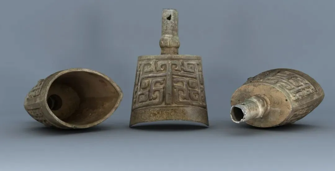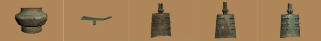 兽面纹铜铙,商代文物,通高77.4厘米,出土于宁乡县老粮仓。铙呈褐绿色,钲部作合瓦形,上宽下窄,甬呈圆管状,与钲腔相通。钲面饰以粗线条组成的兽面纹,左右两侧对称,半浮雕两眼略微凸出,上刻云雷纹。隧部浅浮雕装饰满云雷纹,钲的周边、甬部满饰云雷纹。