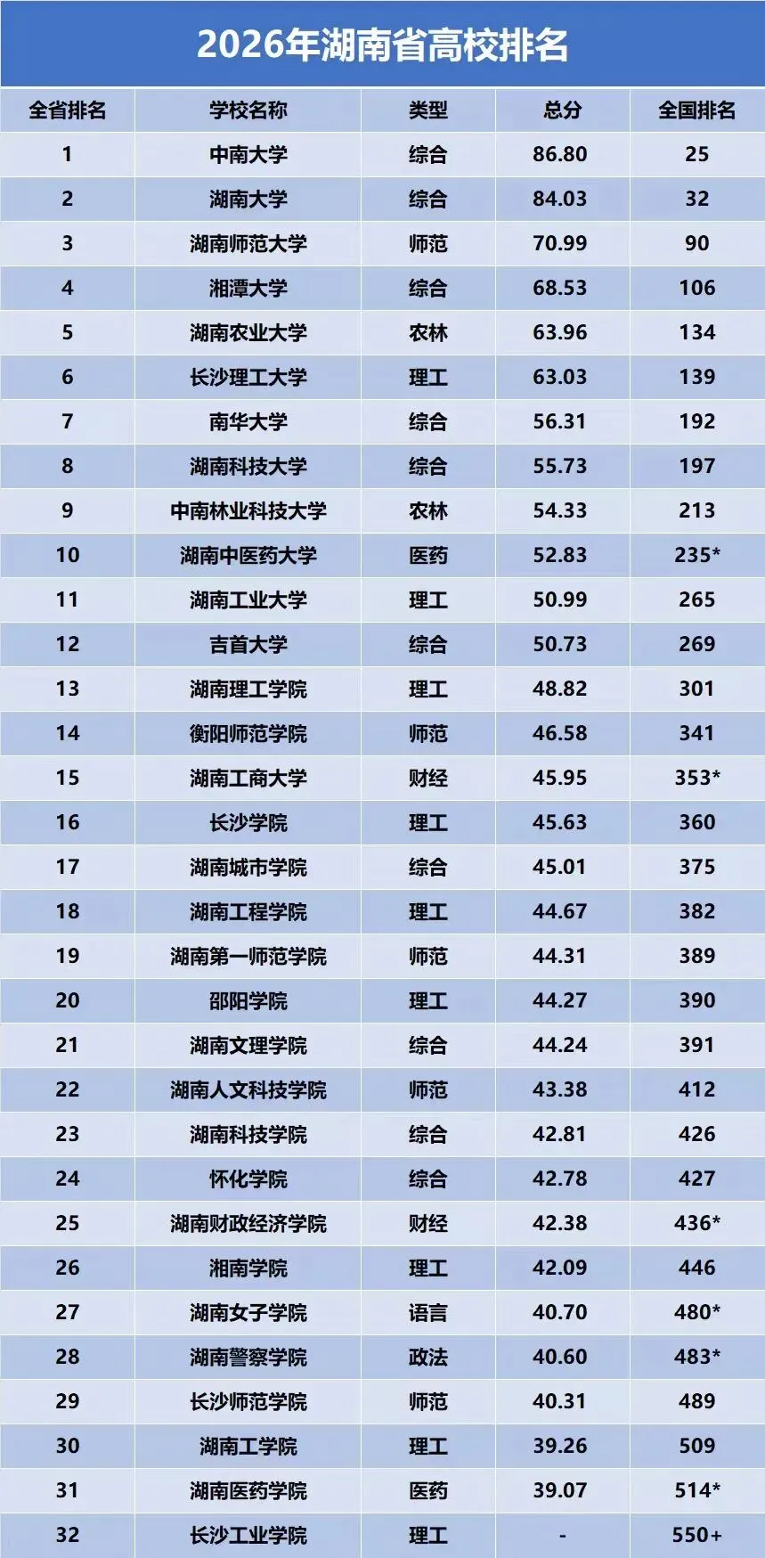 以上就是关于2026年湖南省高校的初步排名情况。当然,这份排名主要是看学校的综合实力和毕业生就业质量,相比于单纯看高校的录取分数线,明显会更加综合。