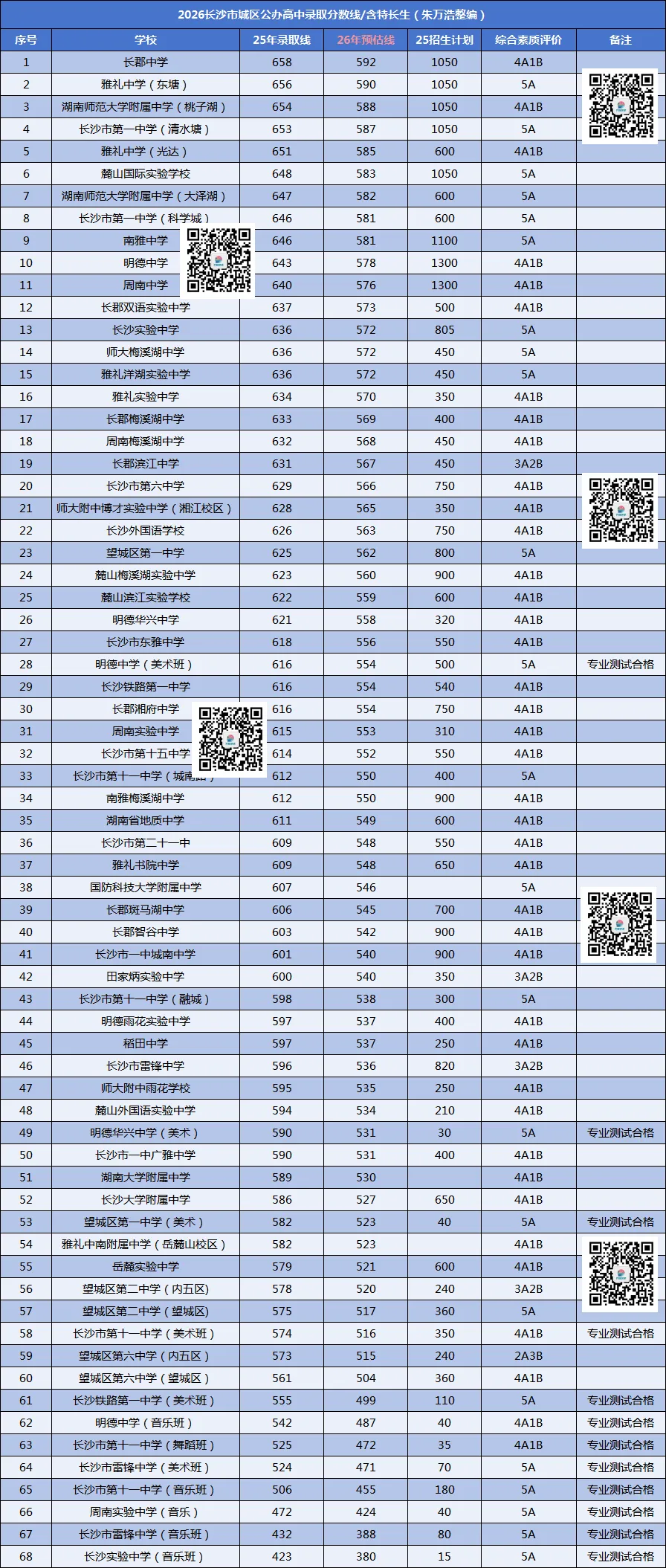 2026长沙市城区公办高中预估线/含特长生(朱万浩整编)
