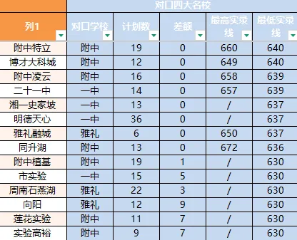 2026年关键提醒:四大继续实行本部+新校区单独划线,参考2025年,一中、附中新校区分数线比本部分低7分,部分新校区分数线与麓山、南雅等名校持平。冲本部有难度的中等偏上学生,重点冲刺新校区,相当于多了一次保底机会,用相近的分数,享受四大的教学资源。