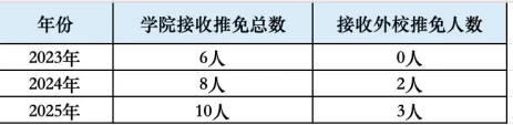 ▌校外接收逐步放开:学院整体接收推免生23年6人→24年8人→25年10人;外校生源更是从23年0人,涨到24年2人、25年3人,对校外优质生源的接纳度越来越高。