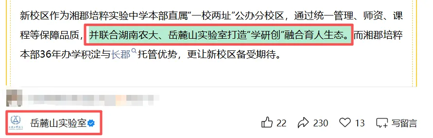 近日,芙蓉区政府、农大、岳麓山实验室同步发表文章也表明,学校的科创教育拥有"农大子弟校、岳麓山实验室子弟校"的身份。