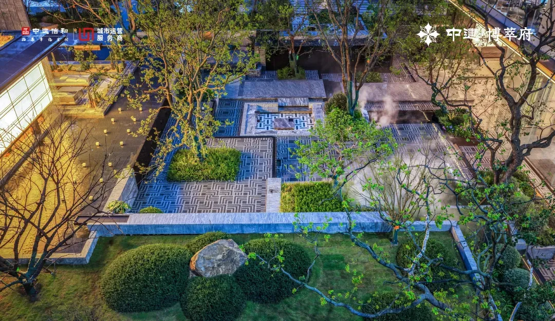 园林萃取岳麓书院文脉底蕴,打造六重递进式归家序列,水景、叠瀑、大树、影壁、下沉会客厅错落有致,步步皆景。