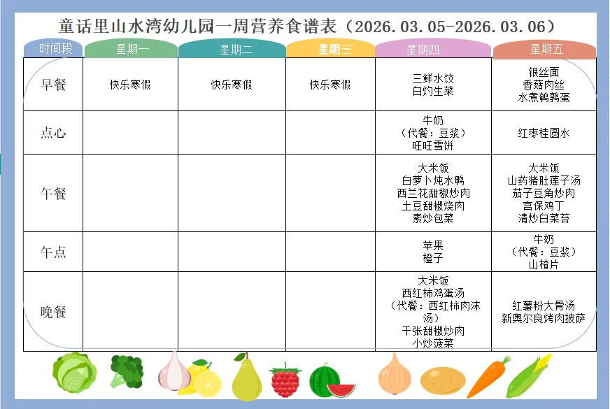 【每周食谱】长沙县湘龙街道童话里山水湾幼儿园2026年春季学期第二周食谱