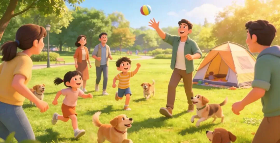 跳山羊游戏开始了,一个孩子弓着背当“小山丘”,其他孩子小心翼翼地助跑、起跳。旺财在旁边汪汪叫着,像是在加油鼓劲。看着孩子们玩得那么起劲,我和爱人还有其他妈妈们也被带动了情绪。不过,毕竟大家才刚认识,彼此之间还隔着一层薄薄的陌生感。我们站在一旁,偶尔轻声交流几句对孩子的夸赞。